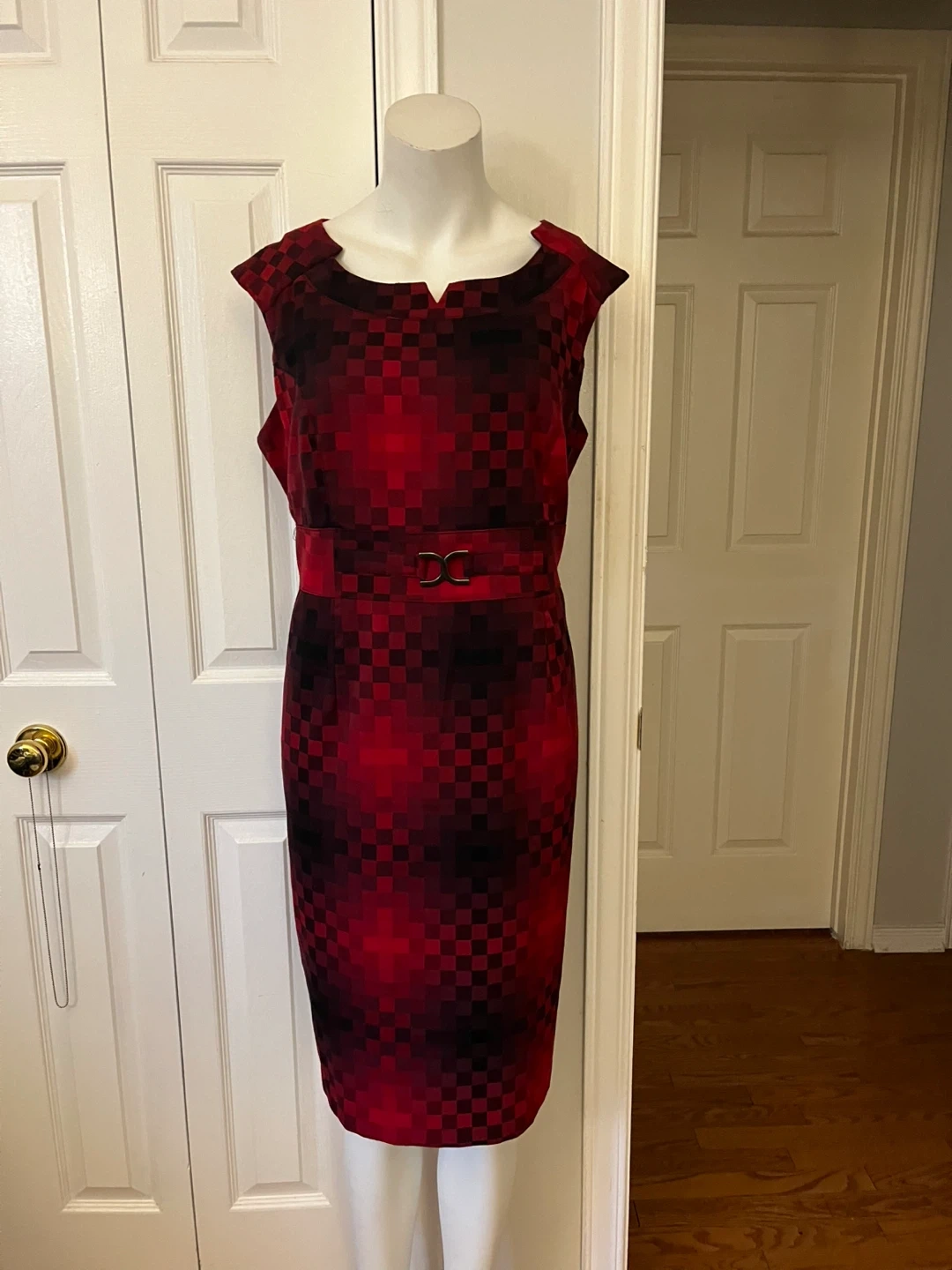 This sleeveless sheath dress from Cleo features a striking red and black checkered pattern. It has a built-in belt with a gold-tone buckle. Size 14. The fabric is a blend, offering a comfortable fit.