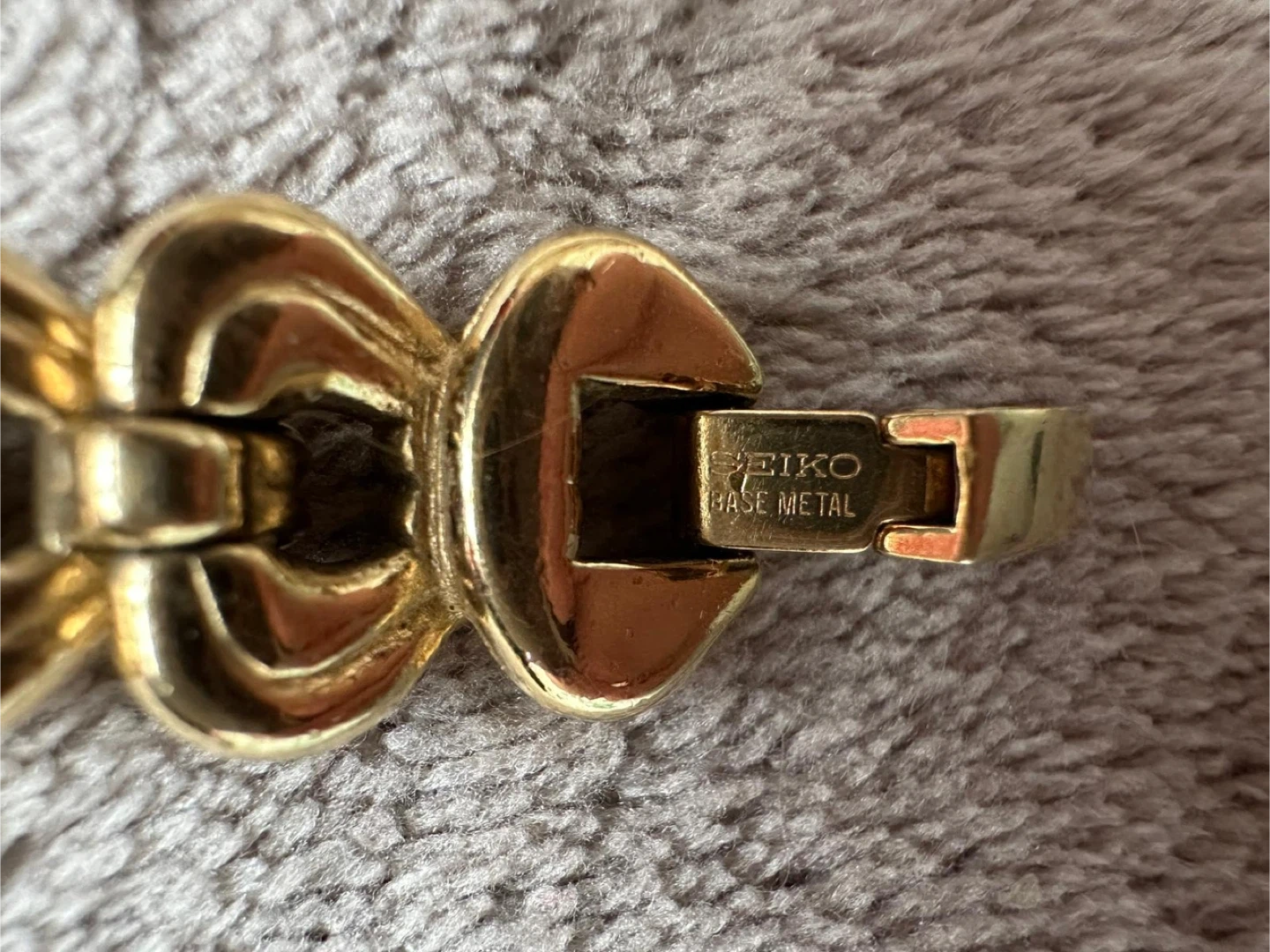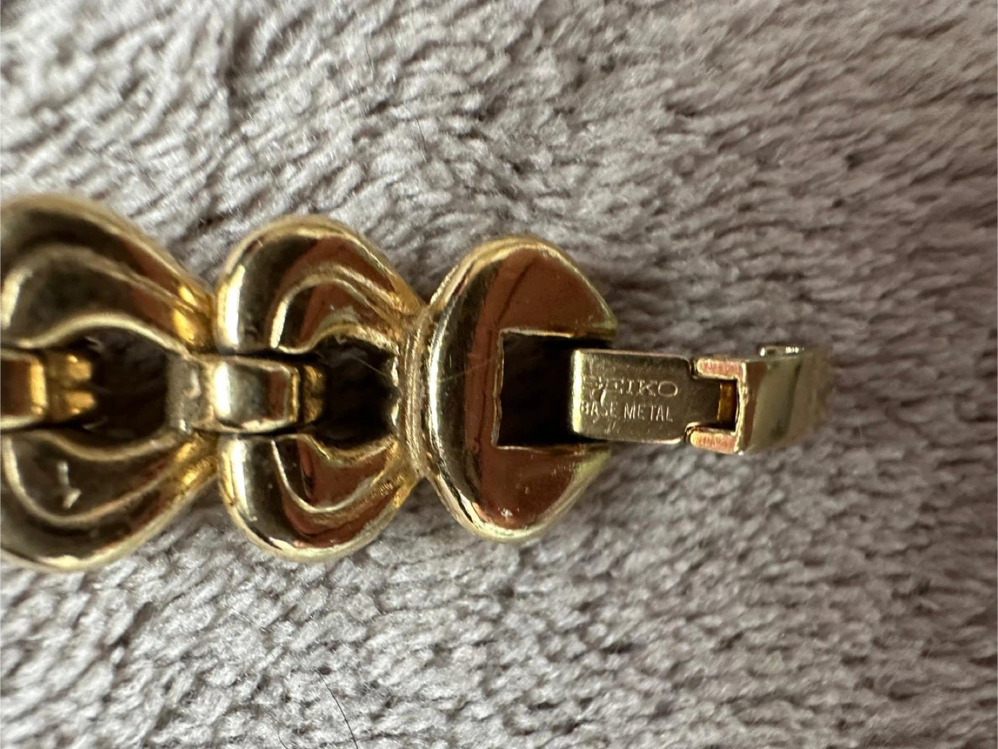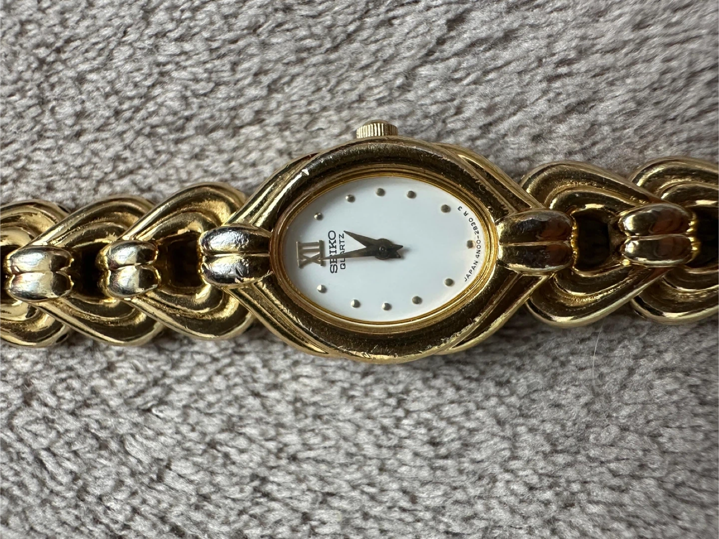 Selling a Seiko Quartz women's watch in gold. It's a beautiful timepiece with a unique woven band design. The back is stamped with "JAPAN O 03058 T". The face is white with Roman numerals at the 12 o'clock position. A stylish accessory for any occasion