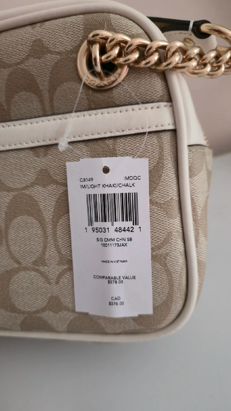 This is a Coach Signature camera bag in the Light Khaki and Chalk colourway. It's made with the brand's signature coated canvas and leather trim. Features a zip-top closure and a gold-tone chain strap. It is brand new, tags and stickers still on it.