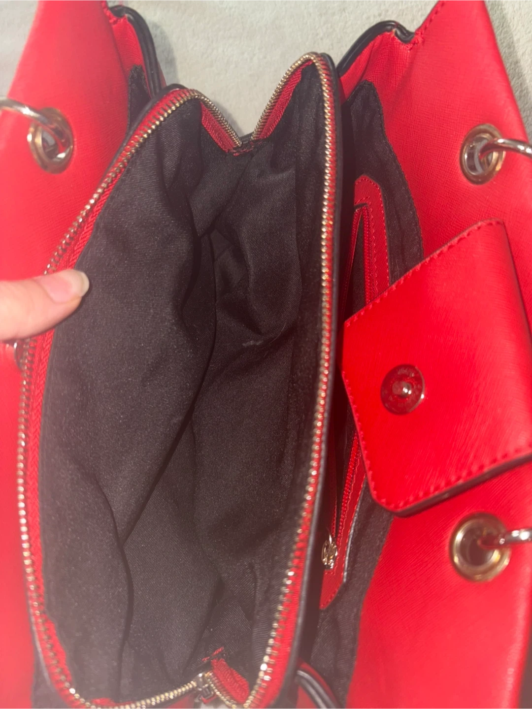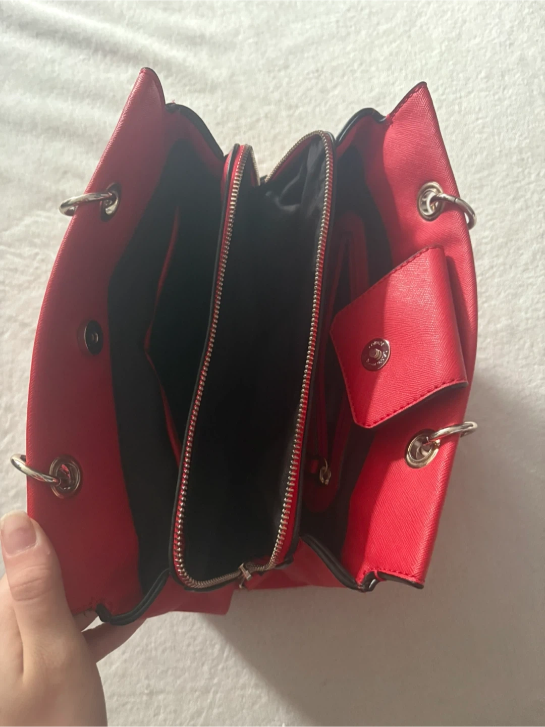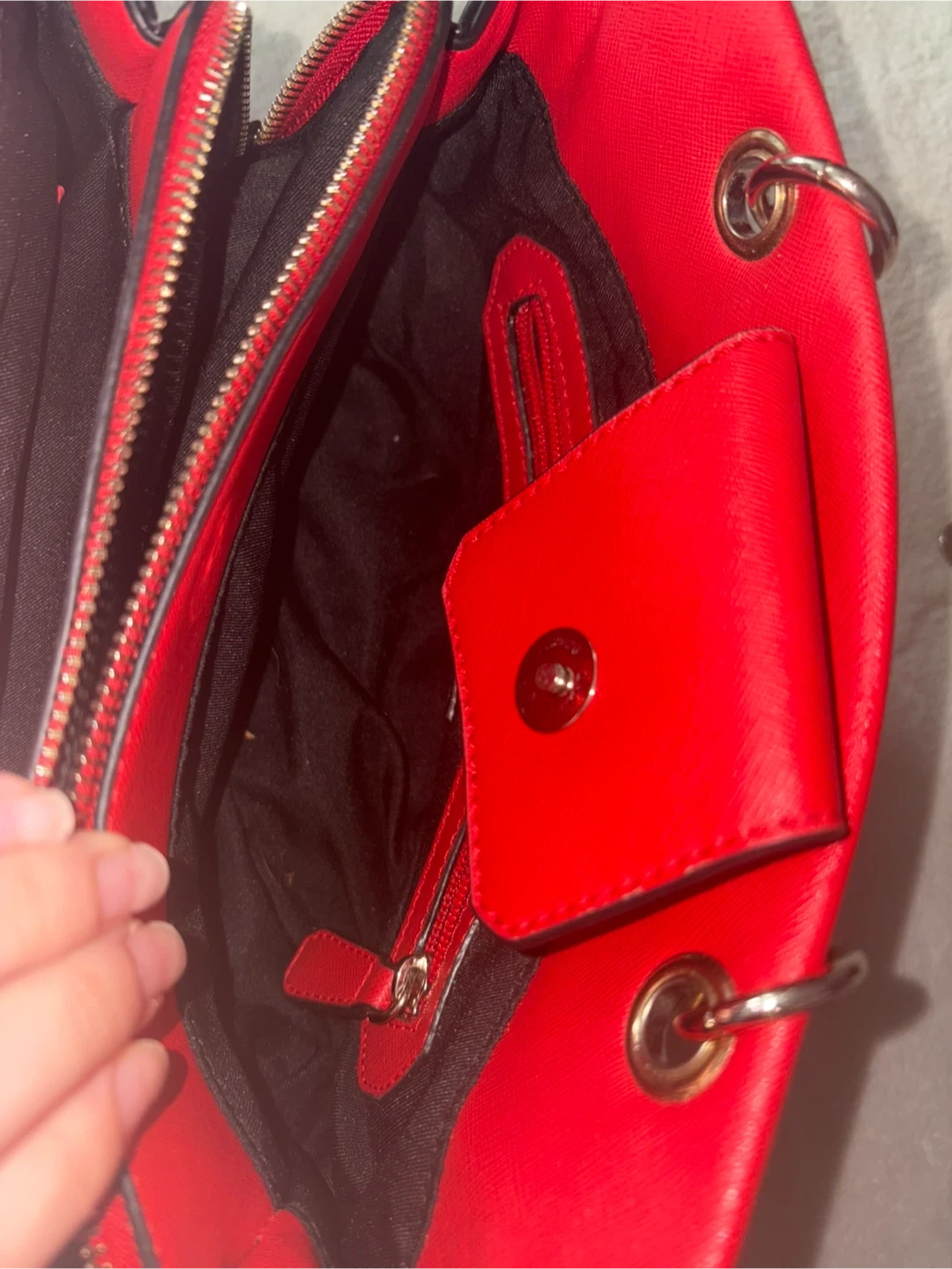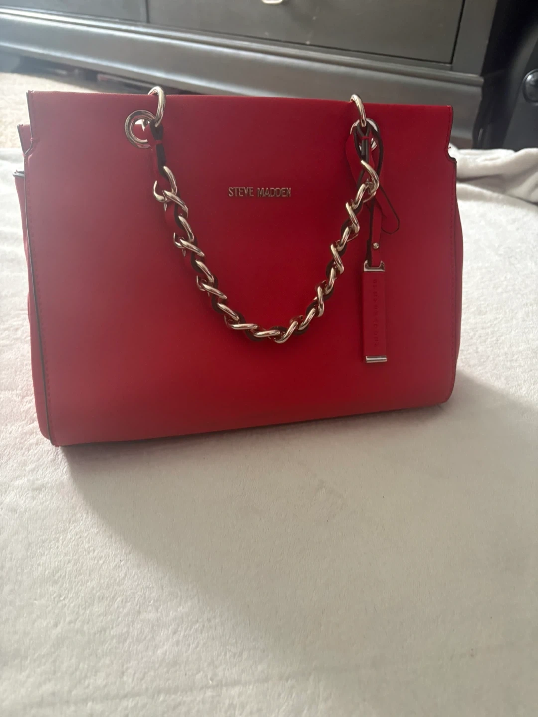 A stylish red handbag from Steve Madden. It features a chain detail and multiple compartments inside for organization. Made with a textured faux leather material.