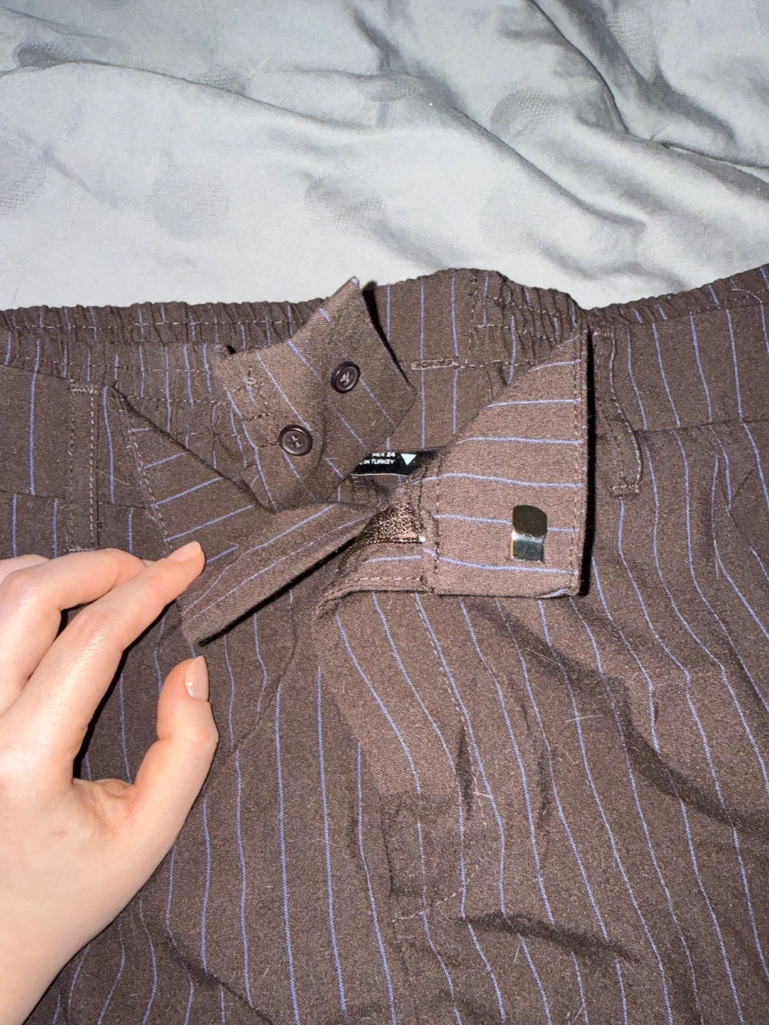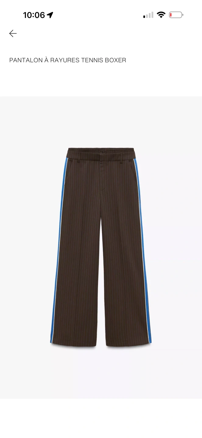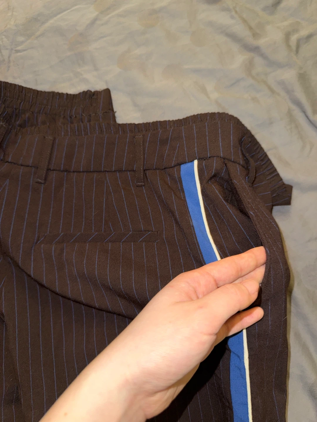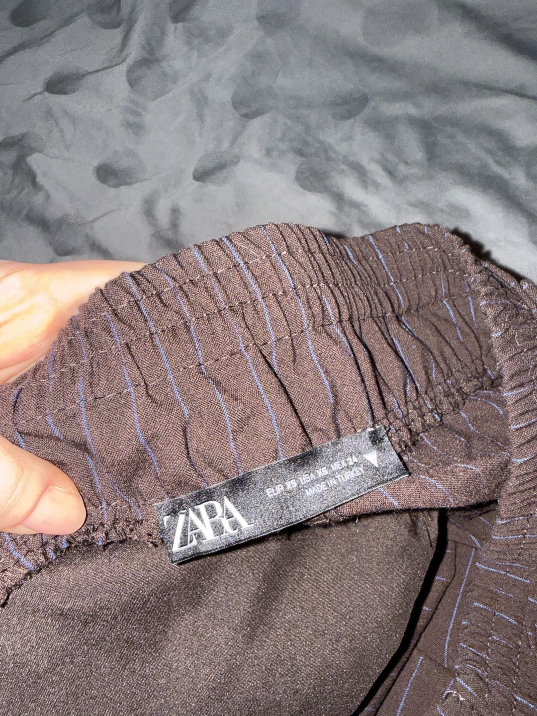 These Zara pants feature a pinstripe pattern with blue and white side stripes. They're made in Turkey and designed with an elastic waistband. Size EUR XS