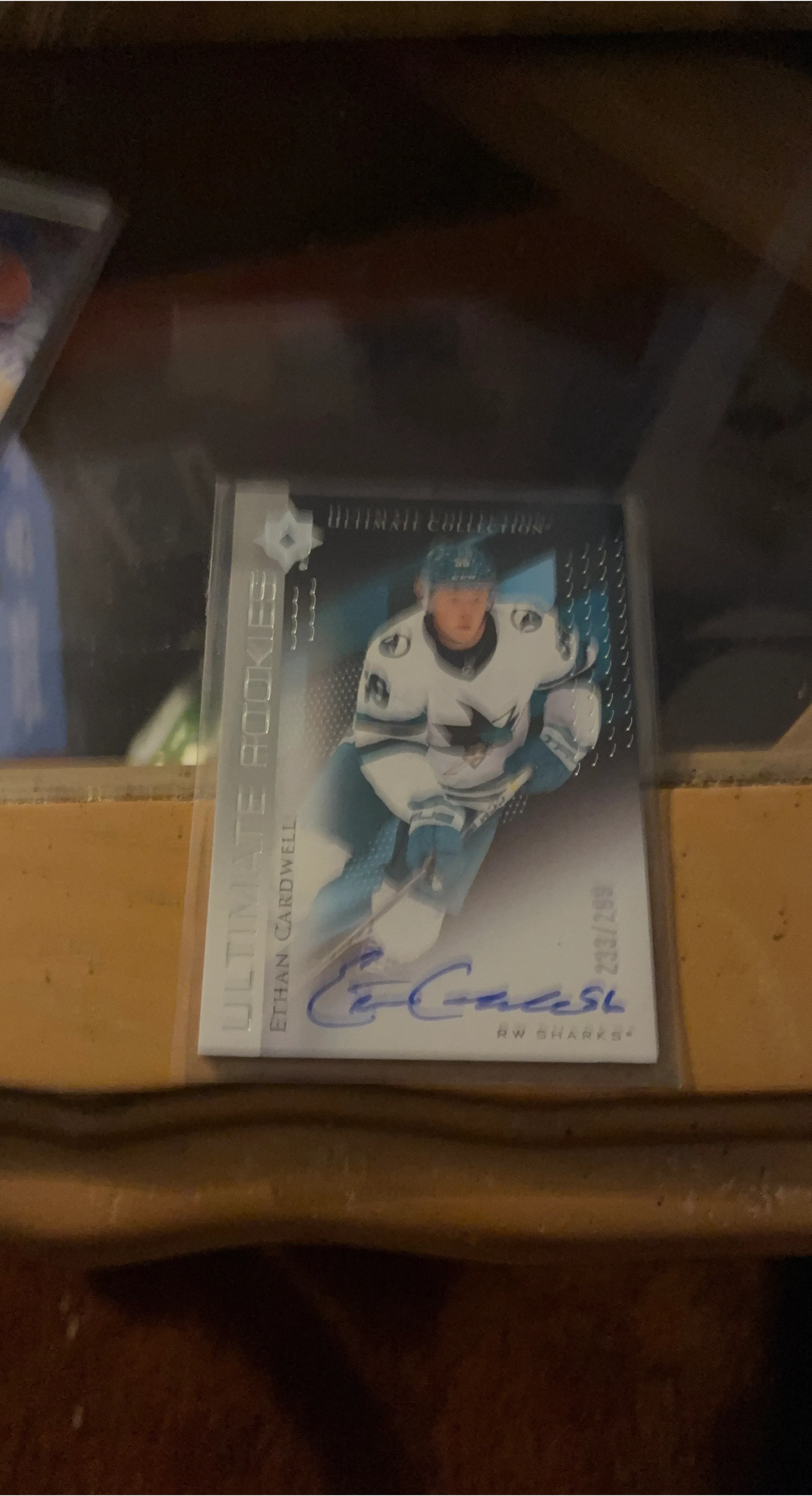 This is an Upper Deck Ultimate Collection rookie card featuring Ethan Cardwell. It's a signed card, numbered 203 out of 299. Card details indicate RW Sharks.