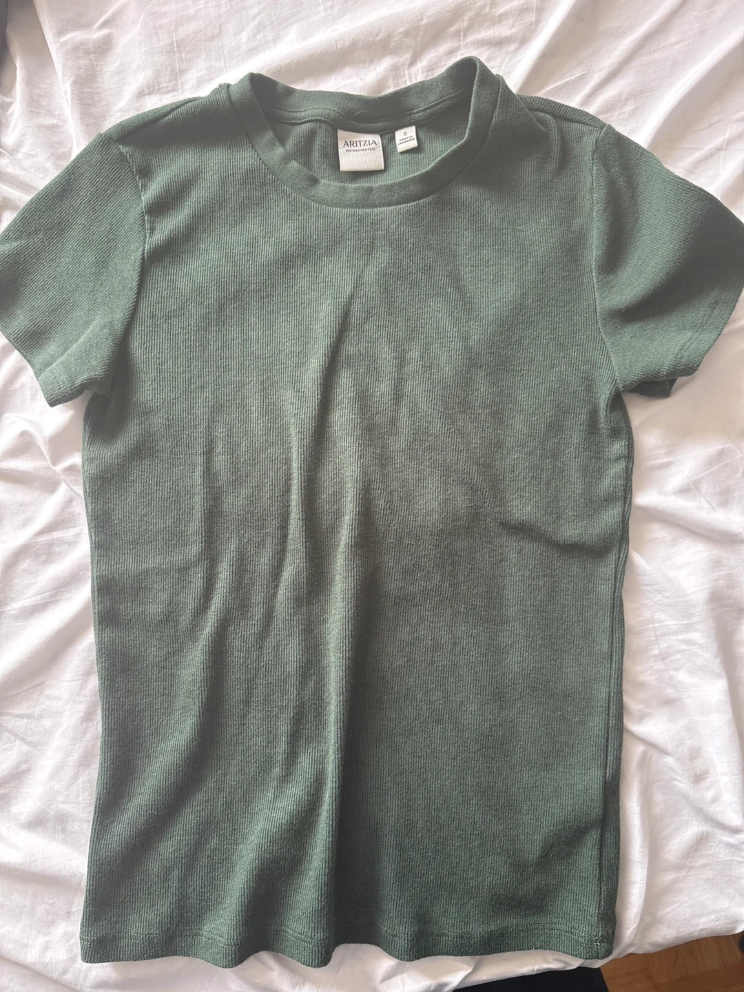 A green ribbed short sleeve t-shirt from Aritzia. Made from a stretch material. Size small. Campus green. Darker colour in person.