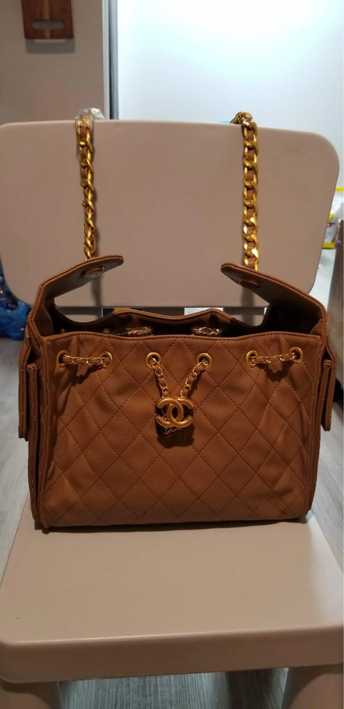 Brown quilted leather drawstring bucket bag. Features gold-tone hardware and chain straps. This stylish bag offers a classic look. Replica