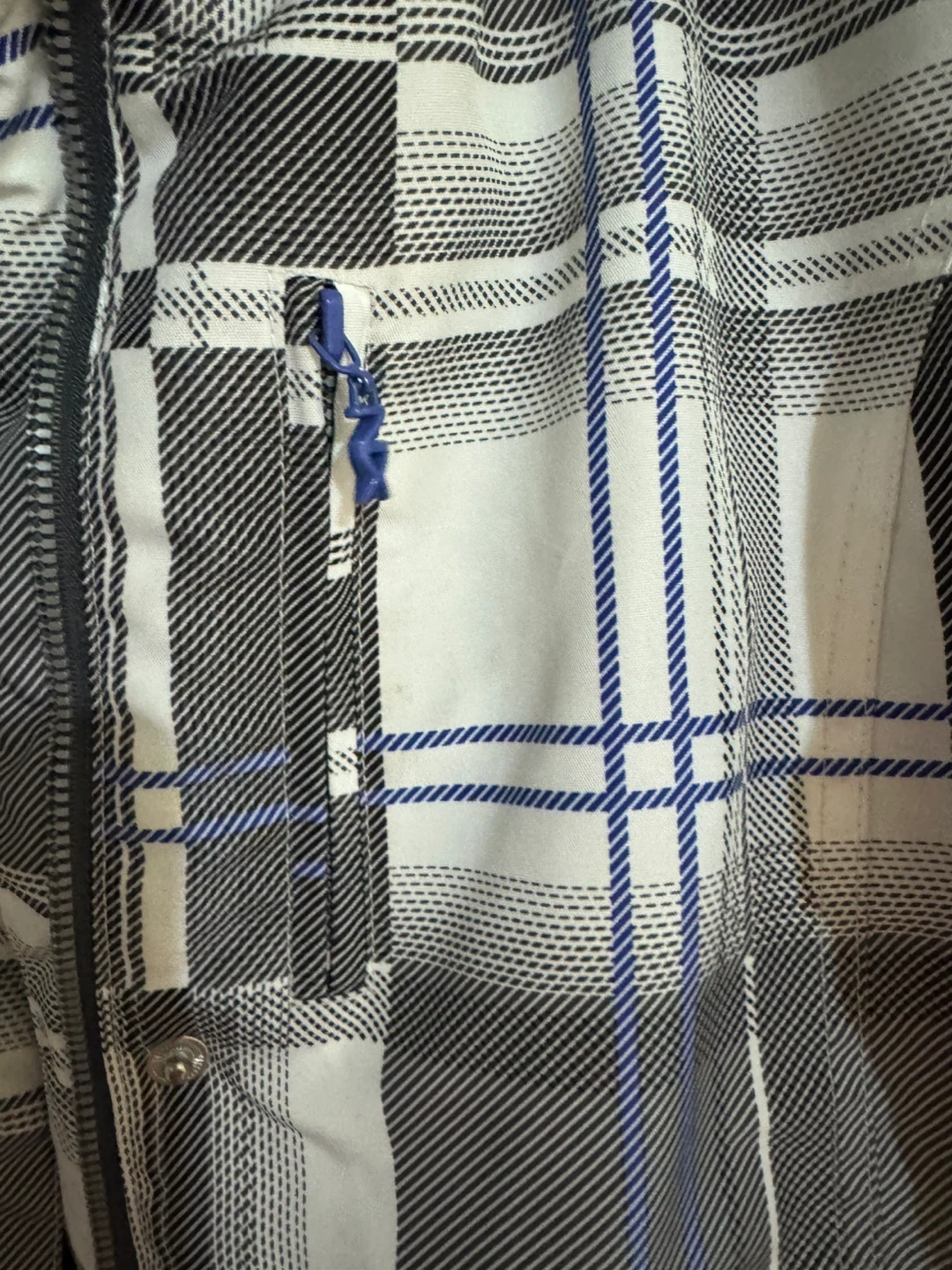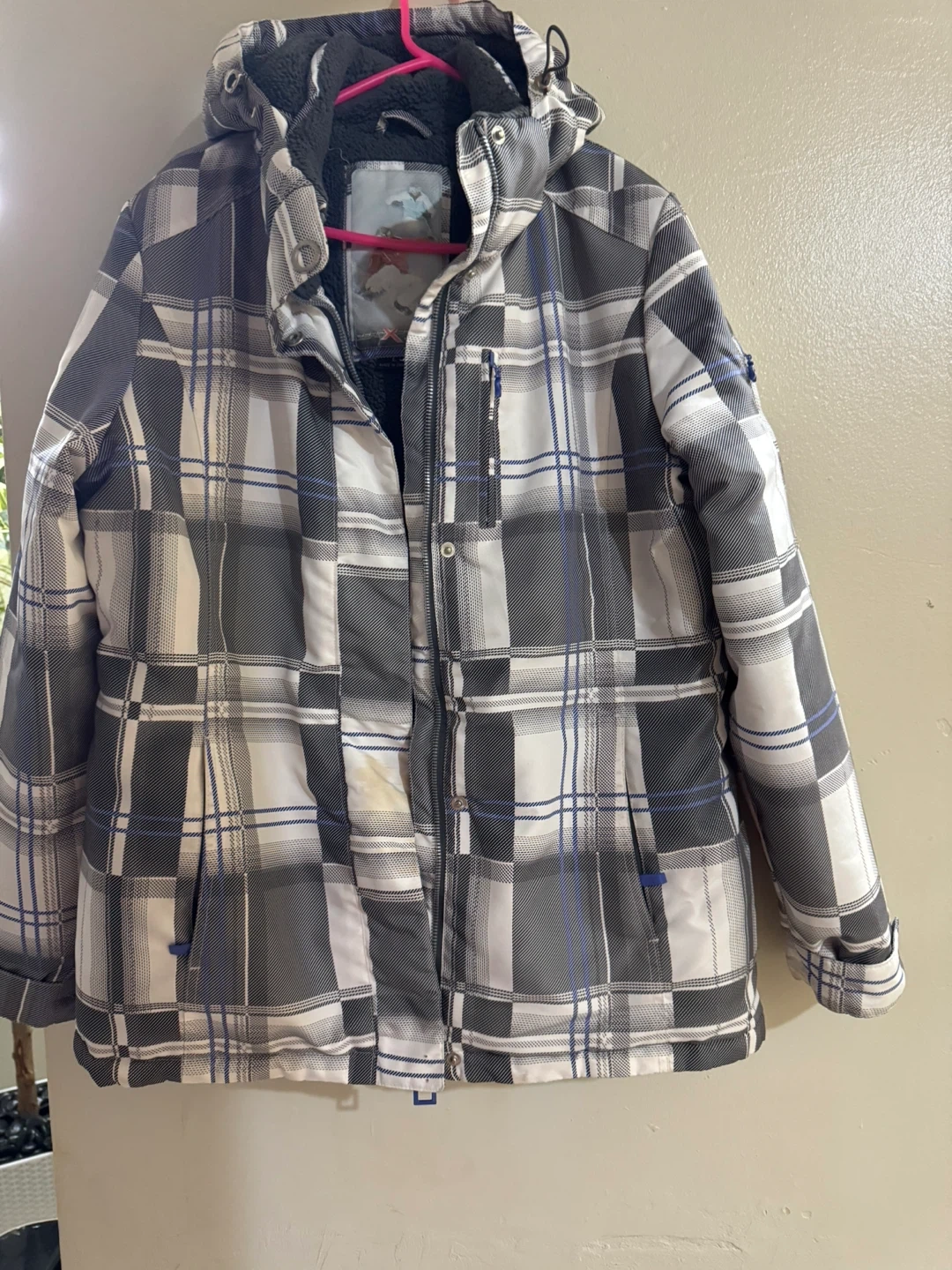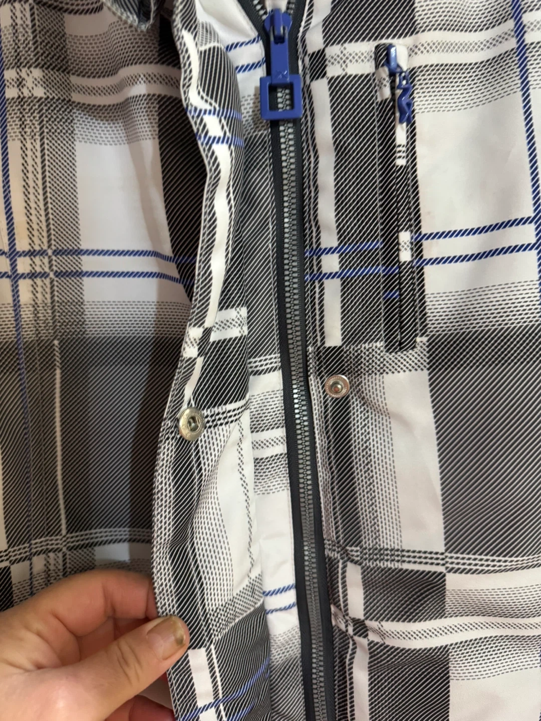 This is a ZeroXposur ski jacket in size large. It features a plaid pattern with blue accents. The jacket is made in China. Missing buttons in the last picture but not effect anything