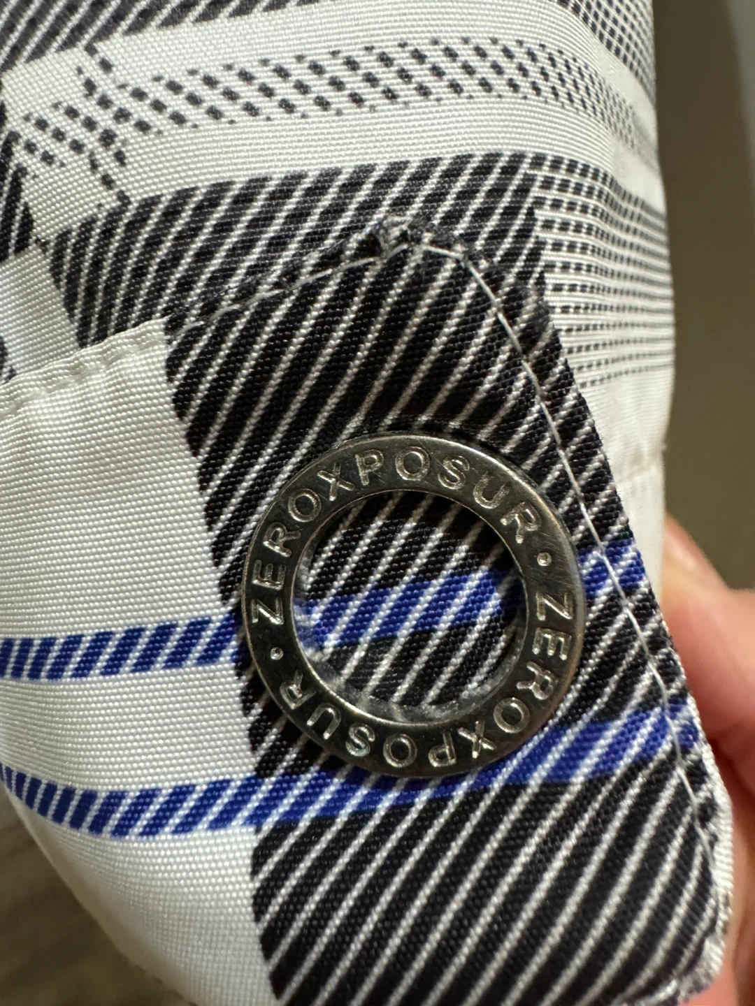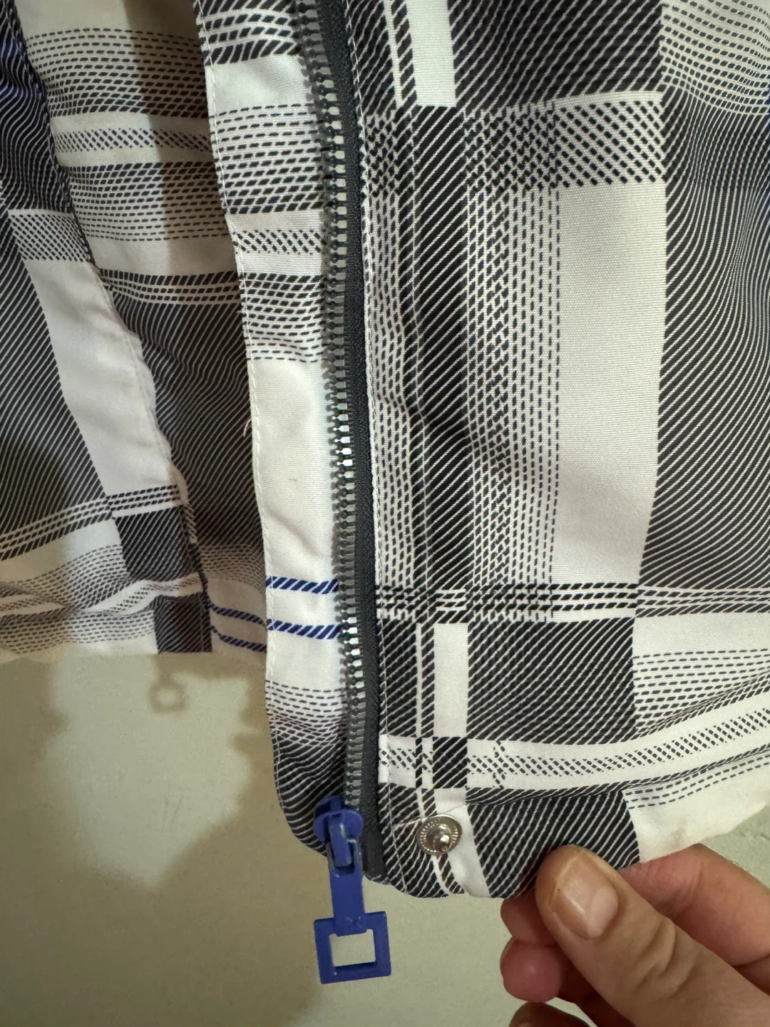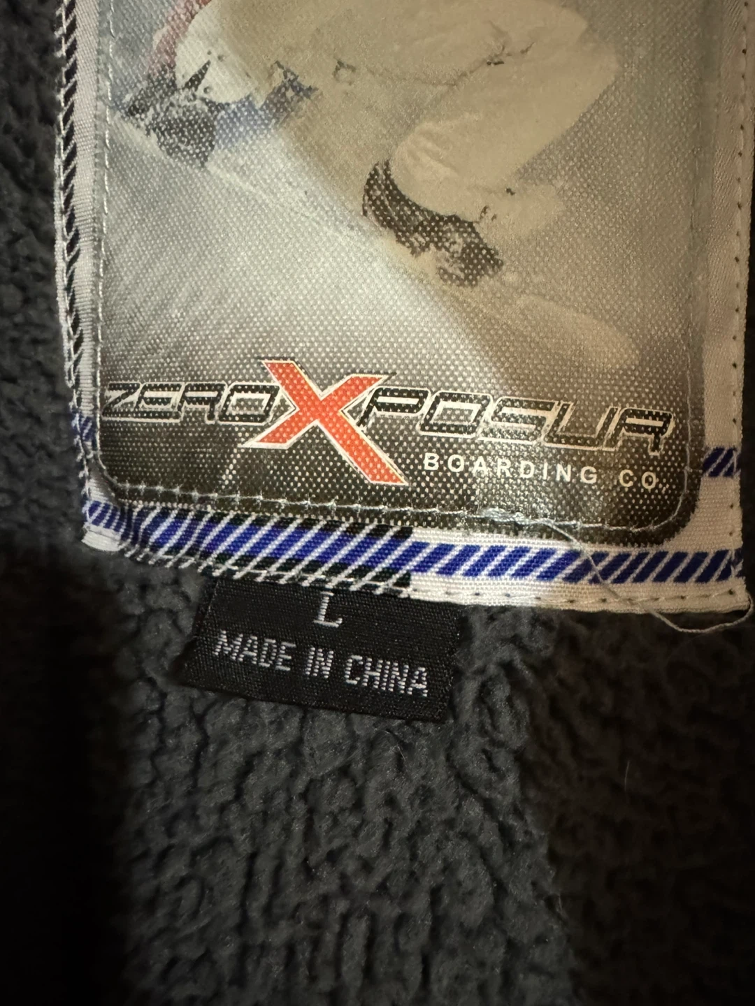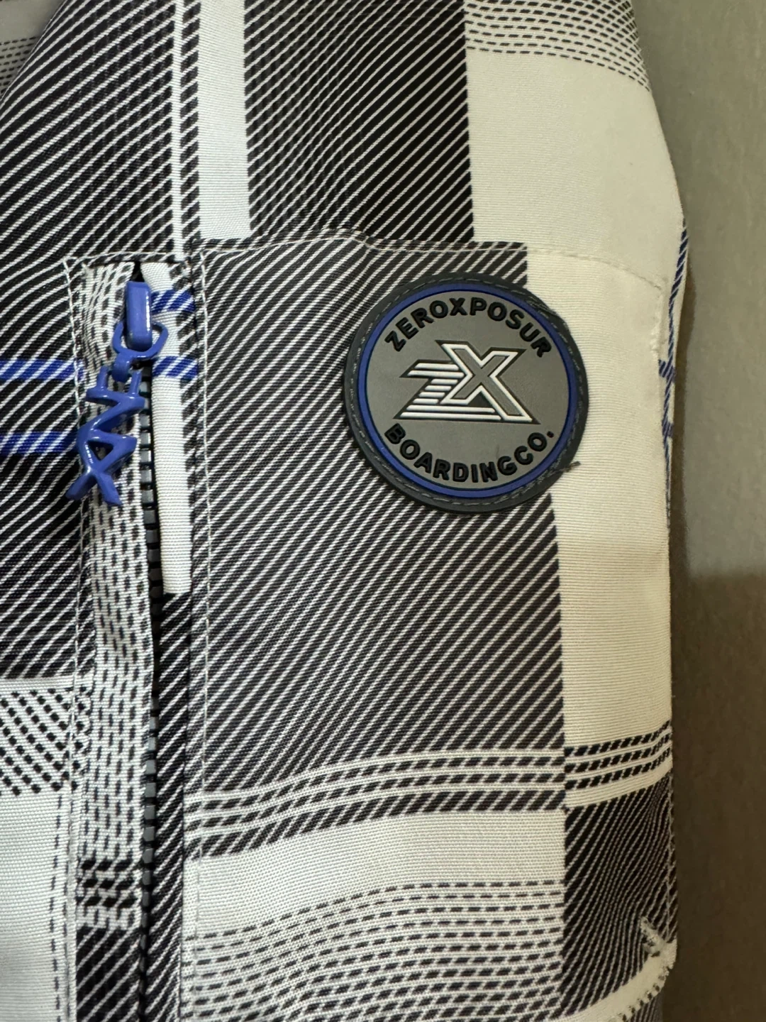 This is a ZeroXposur ski jacket in size large. It features a plaid pattern with blue accents. The jacket is made in China. Missing buttons in the last picture but not effect anything