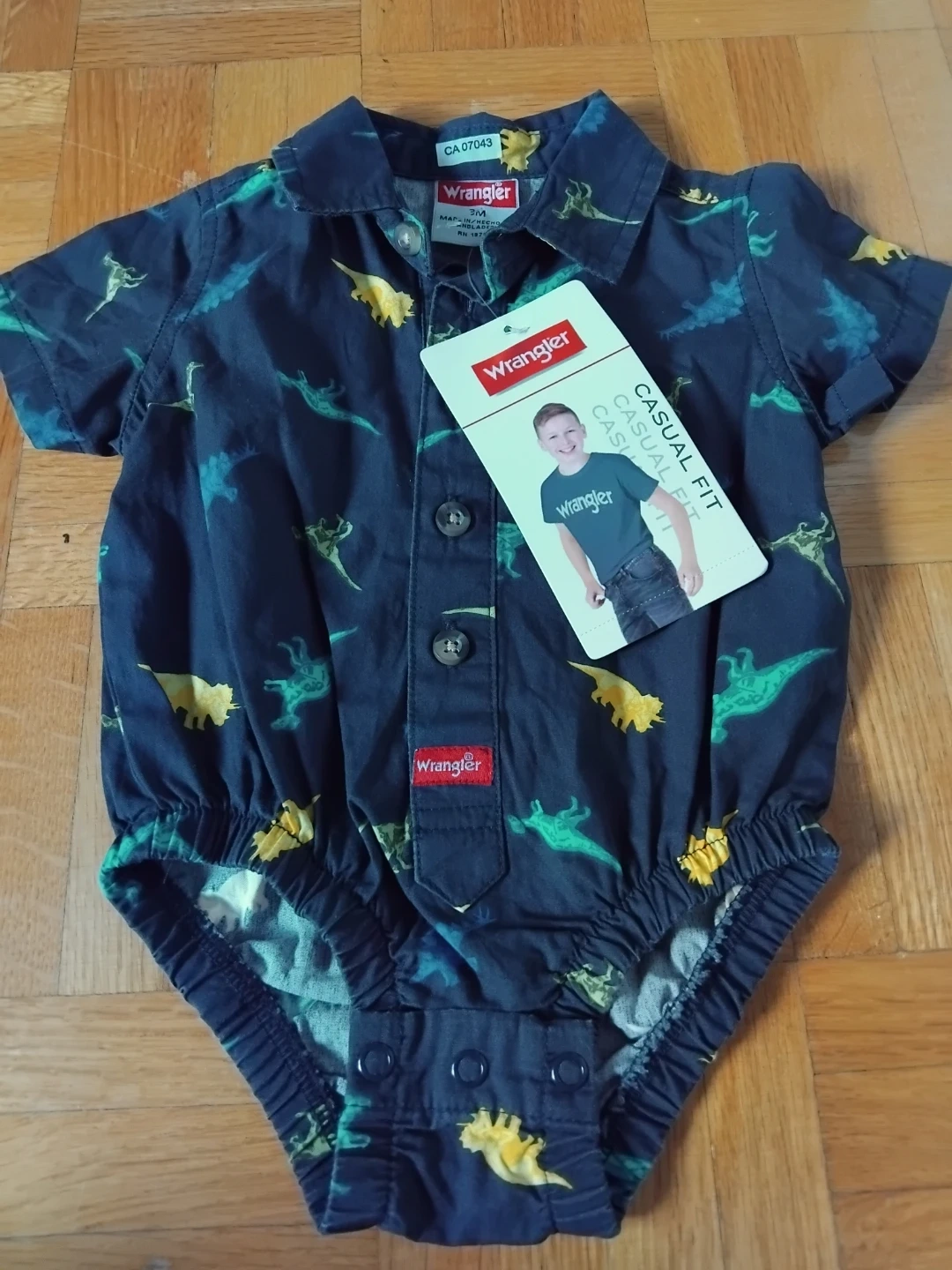 38This Wrangler bodysuit is brand new with tags and ready for your little one! It features a fun dinosaur print on a navy blue background. Size: 3M