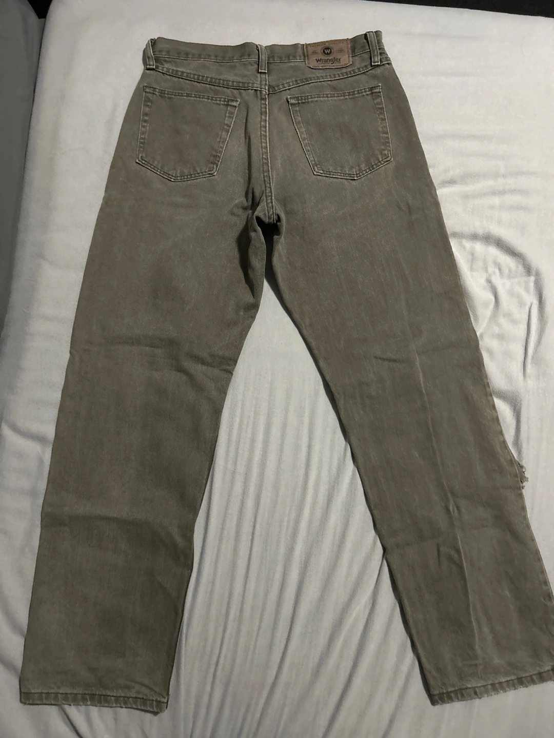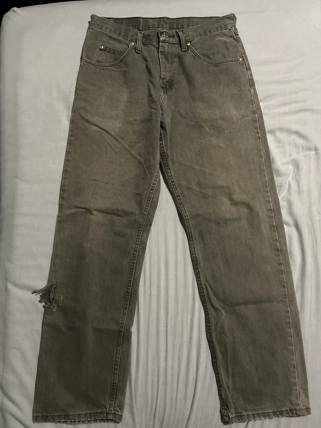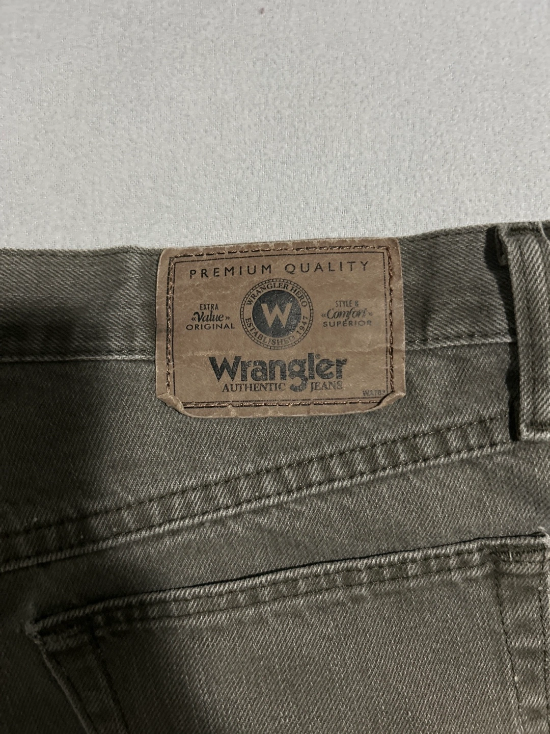 10Wrangler men's jeans. Dark olive green colour. Straight leg. Small tear on one leg. Premium quality.