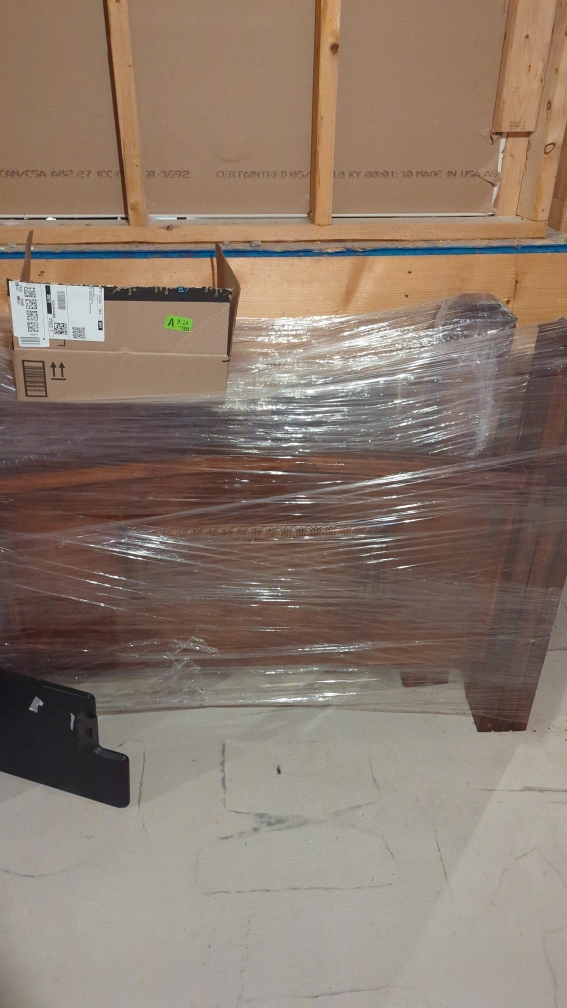 10Large wooden chest wrapped in plastic. Appears to be on a stand. Unassembled.