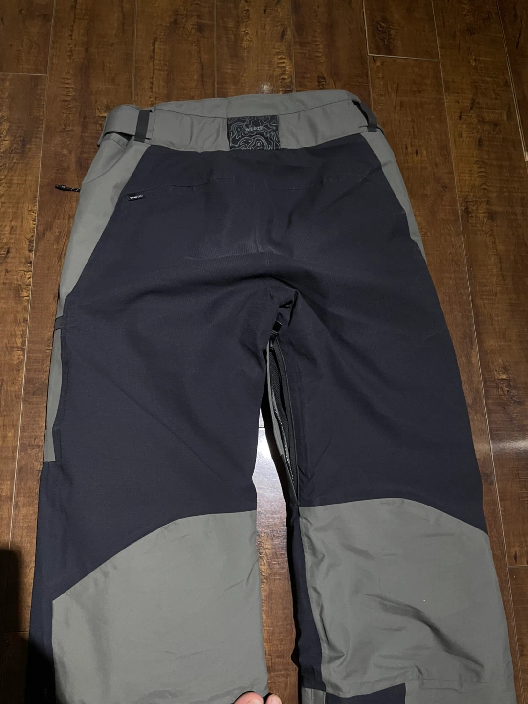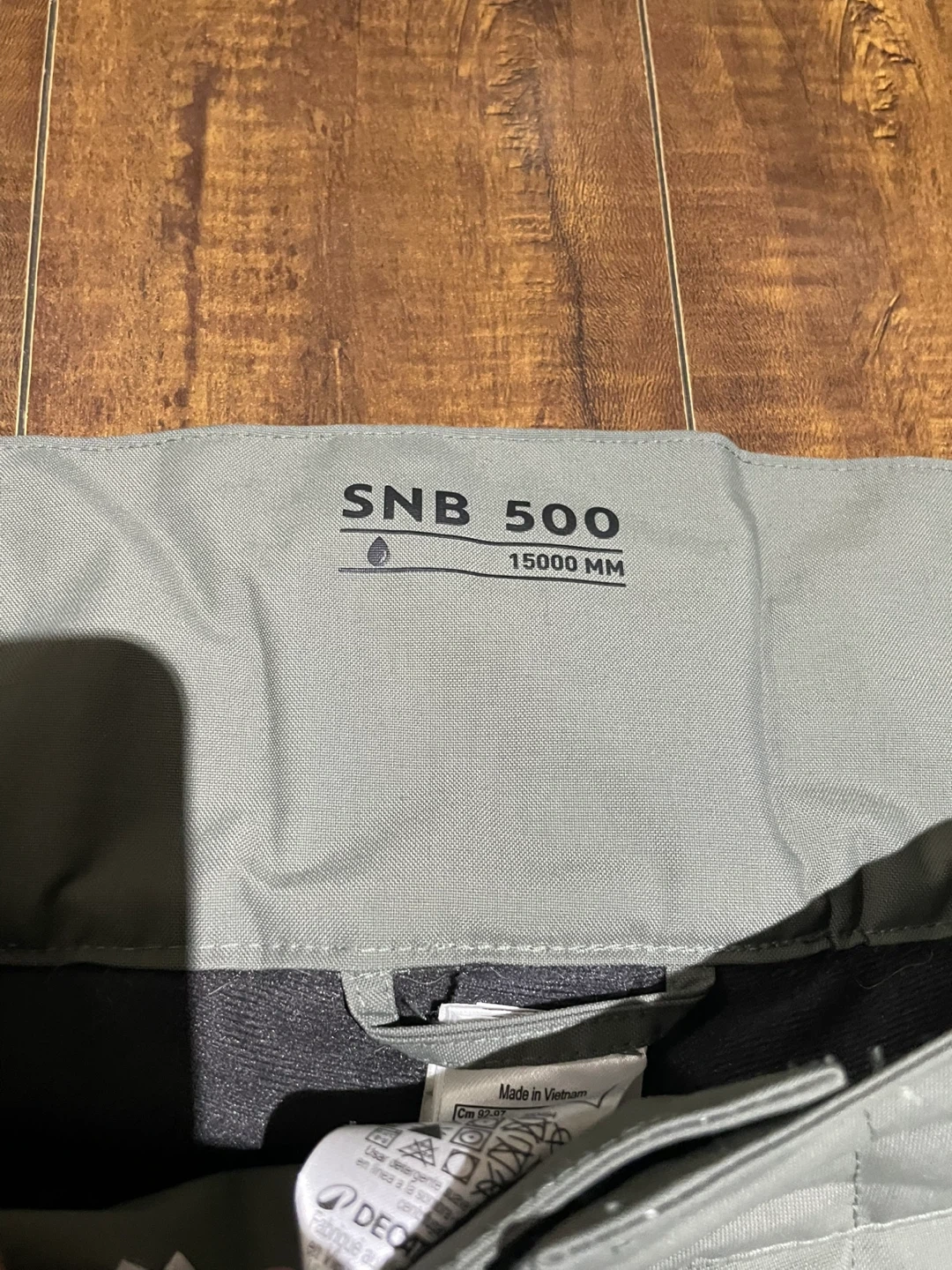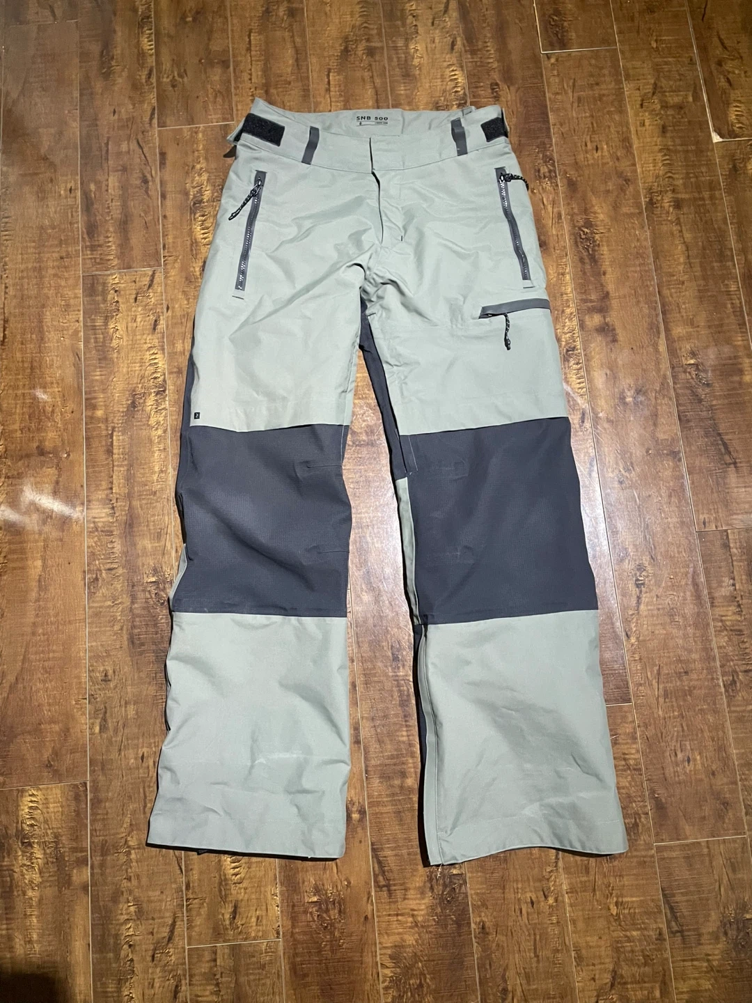 Men’s Warm, Waterproof Snowboard Trousers SNB 500. They feature a black, grey, and olive colourway with zippered pockets. These pants are built for the slopes!