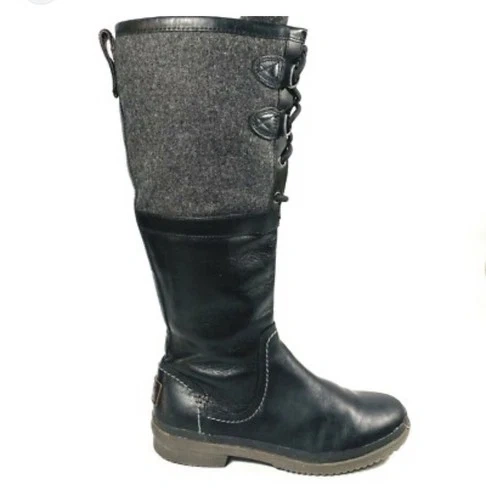 UGG Women's Elsa Tall Boots, a waterproof style featuring a blend of leather and a wool-blend textile upper. They feature decorative lacing at the top of the shaft and a functional medial side zipper for easy wear. The boots are lined with UGGpure™ wool for warmth and have a durable, cork-infused Spider Rubber outsole for enhanced traction in slippery conditions. They are designed as a stylish, yet functional, option for cold or rainy weather, offering a more feminine silhouette than traditional bulky snow boots. The lower section of the boot is made from a waterproof black leather, while the upper shaft is a grey wool-blend textile. Condition is excellent, please see all photos.