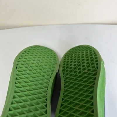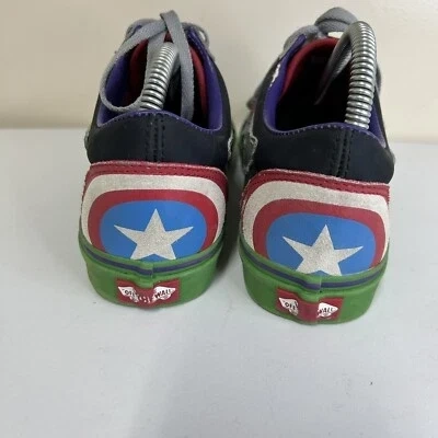 size 10 Vans Old Skool sneakers featuring a Captain America shield design. They have a mix of blue, green, and black uppers with red laces. The soles are bright green with the classic Vans "Off the Wall" logo.