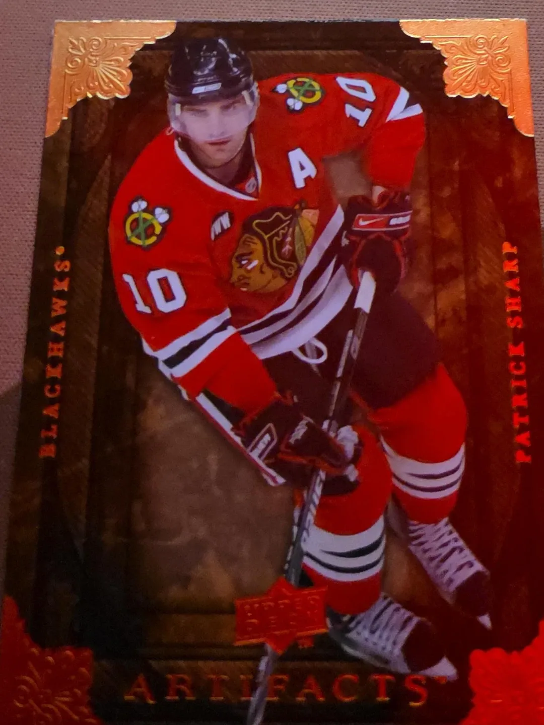This is an Upper Deck Artifacts hockey card featuring Patrick Sharp. Patrick Sharp is a former NHL player.