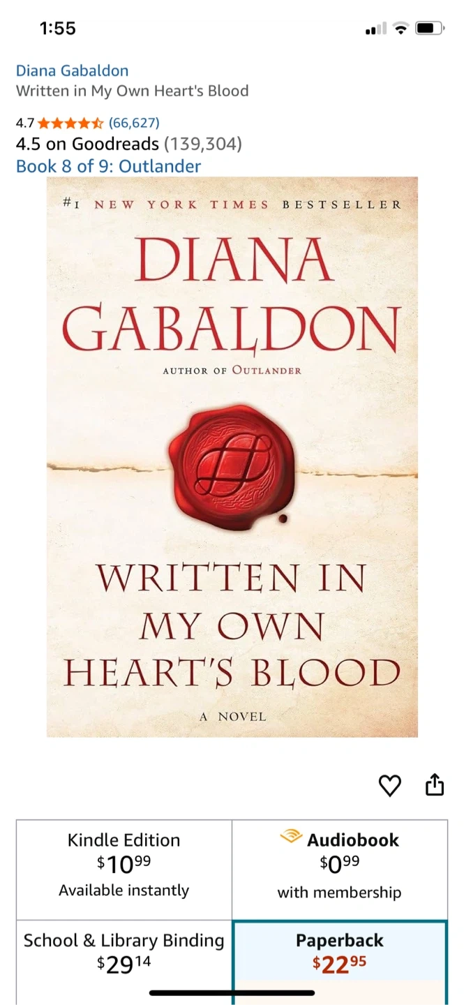 96• Main Intersections are HURONTARIO•STEELES just before downtown Brampton • MINT CONDITION • LARGE PAPERBACK • WRITTEN IN My Own Heart's Blood • Diana GABALDON • It is the eighth book in the Outlander series. • #1 NEW YORK TIMES BESTSELLER • NOVEL • 825 Pages • $12 • Peel Village Area