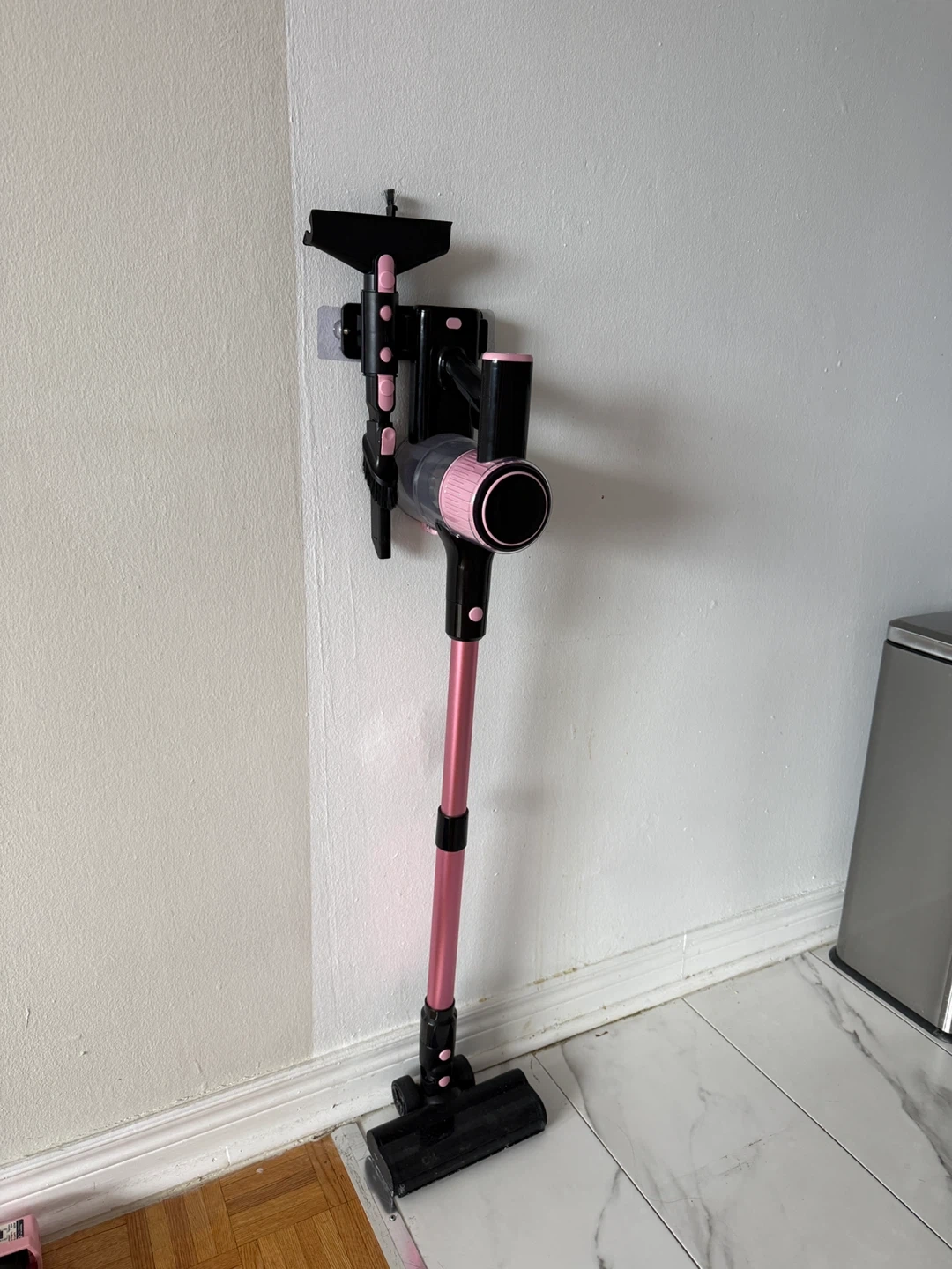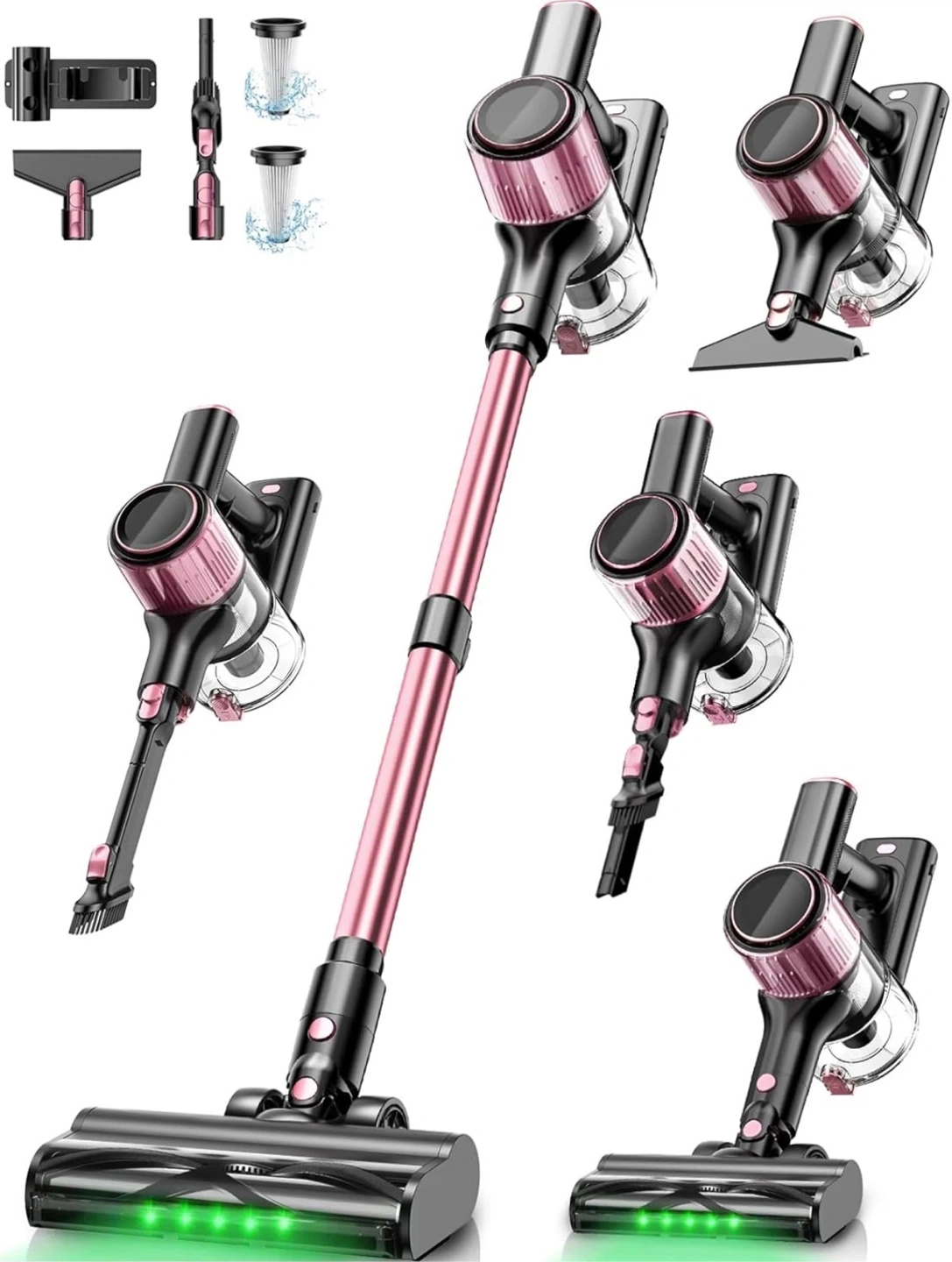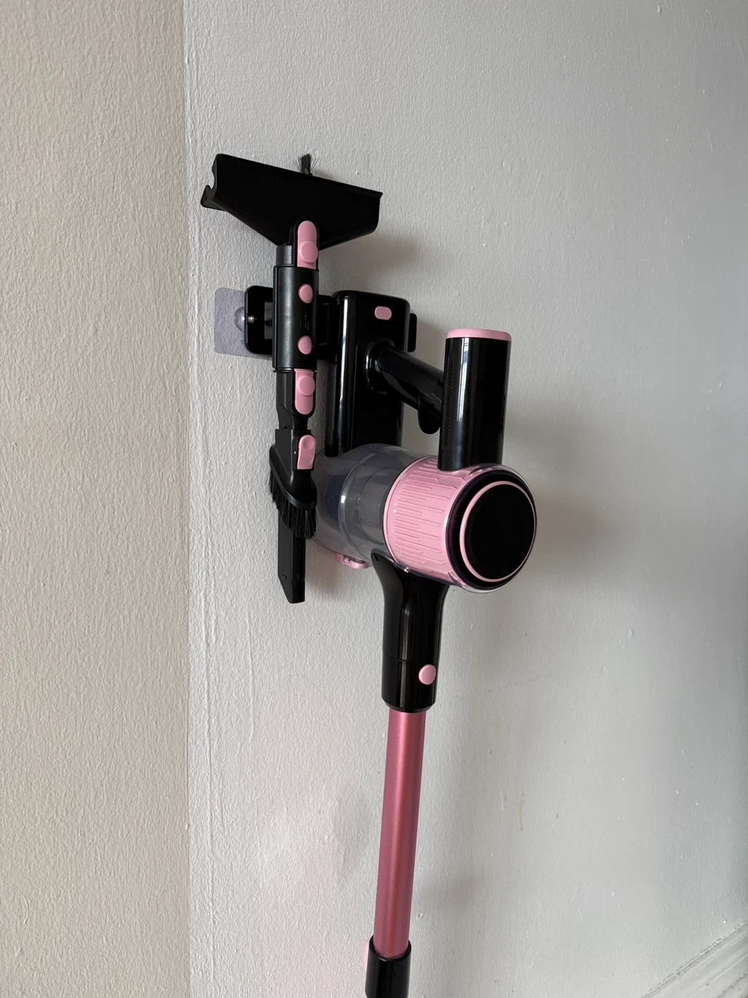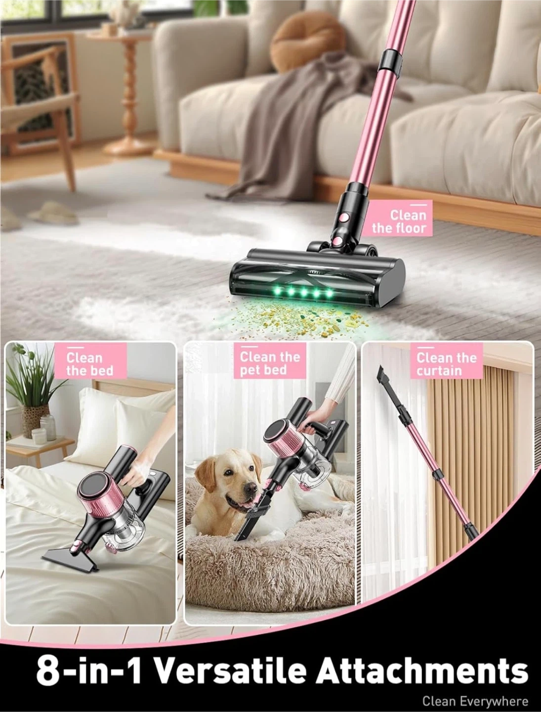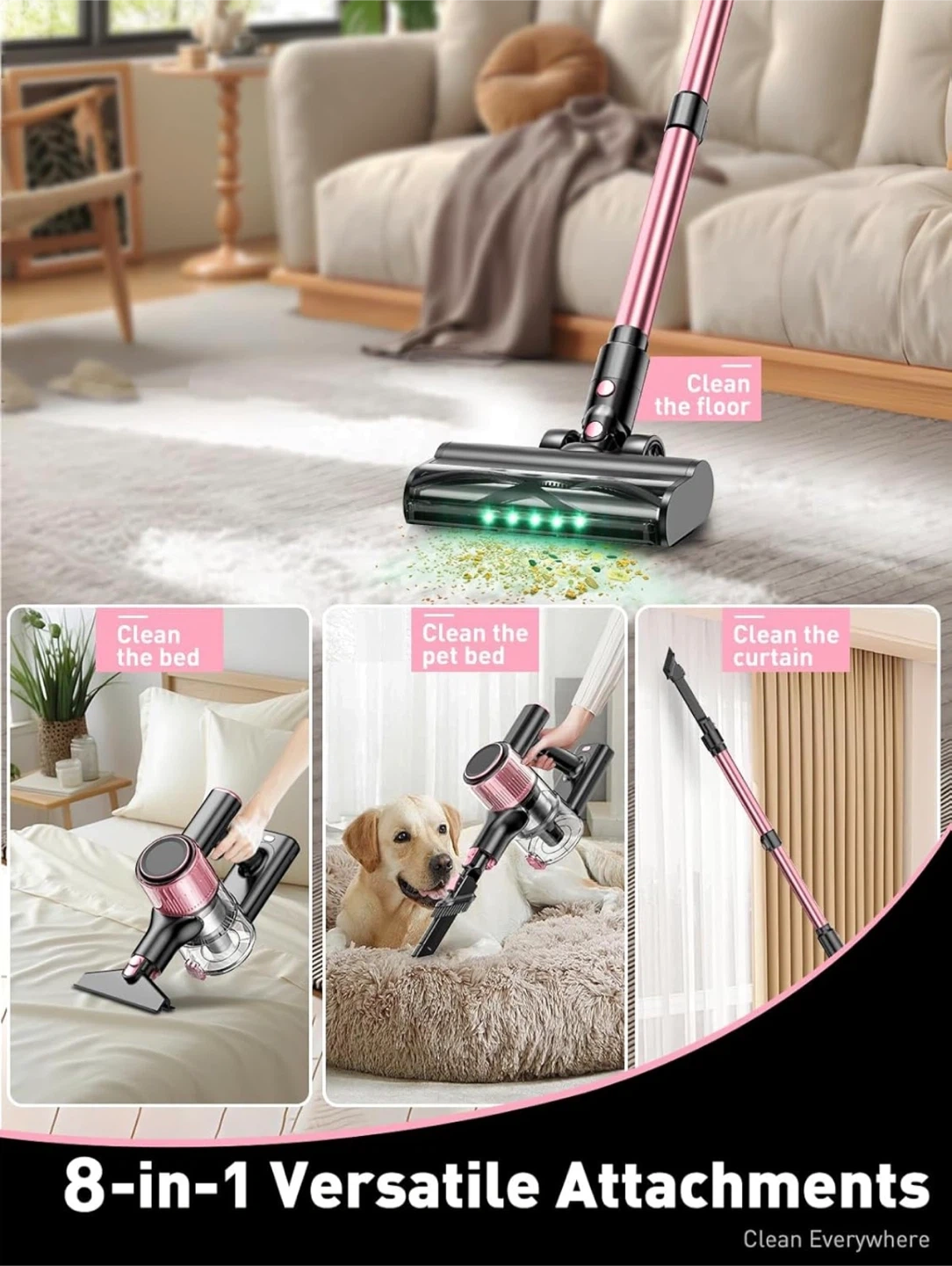 This pink cordless stick vacuum cleaner offers versatile cleaning with 8 attachments. It's great for cleaning floors, beds, pet beds, and even curtains. The lightweight design makes it easy to manoeuvre for all your cleaning needs!