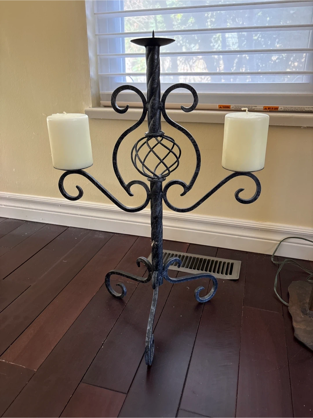 10Selling a wrought iron candle holder. It features a sturdy base and intricate detailing, holding 3 candles securely. It's in excellent condition.