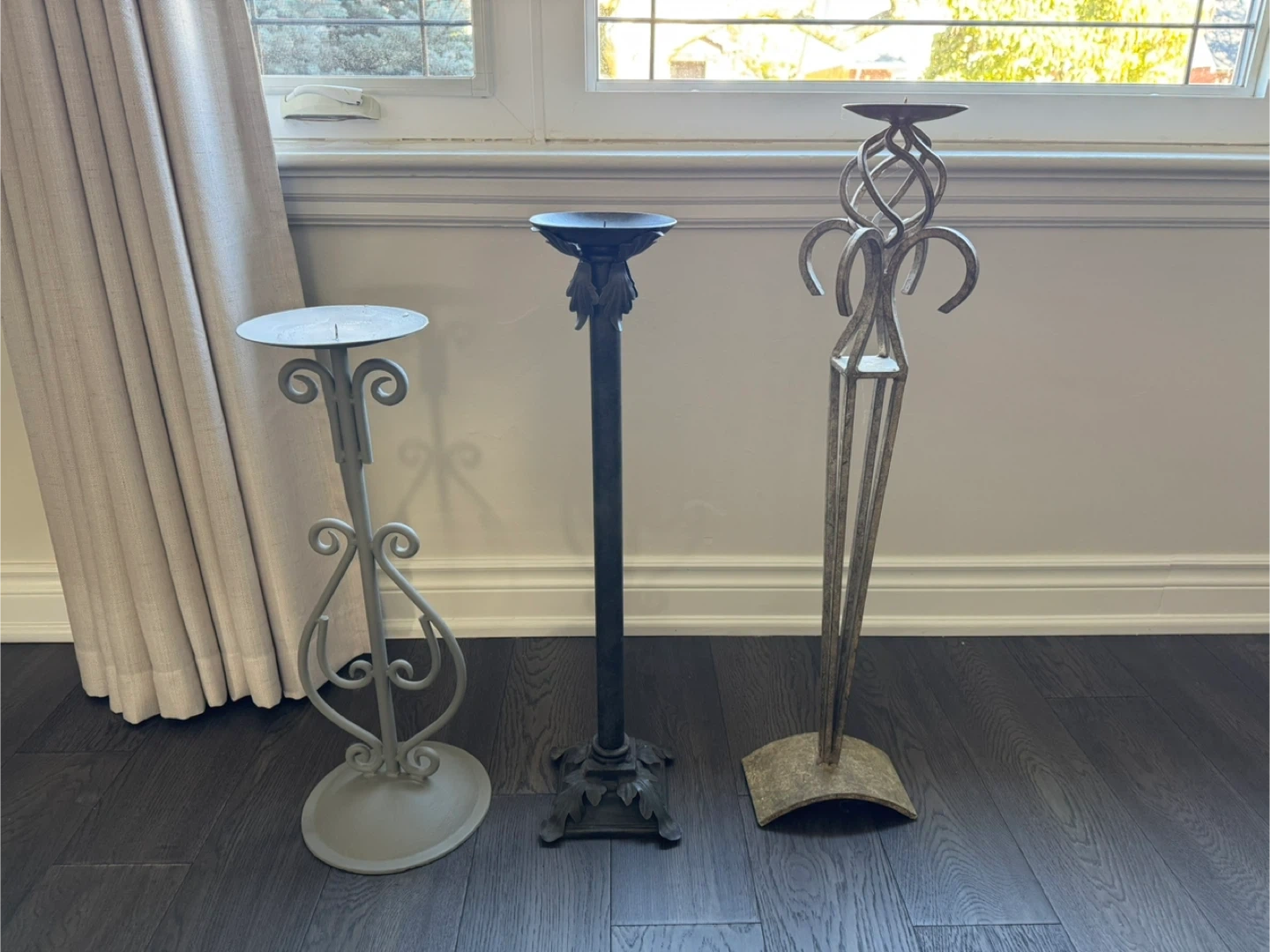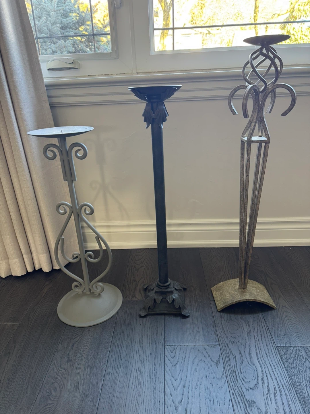 45Selling three decorative candle holders. They are in great condition and would add a nice touch to any room! Wrought iron and heights range from 24” to 32”. Selling them $20 each.