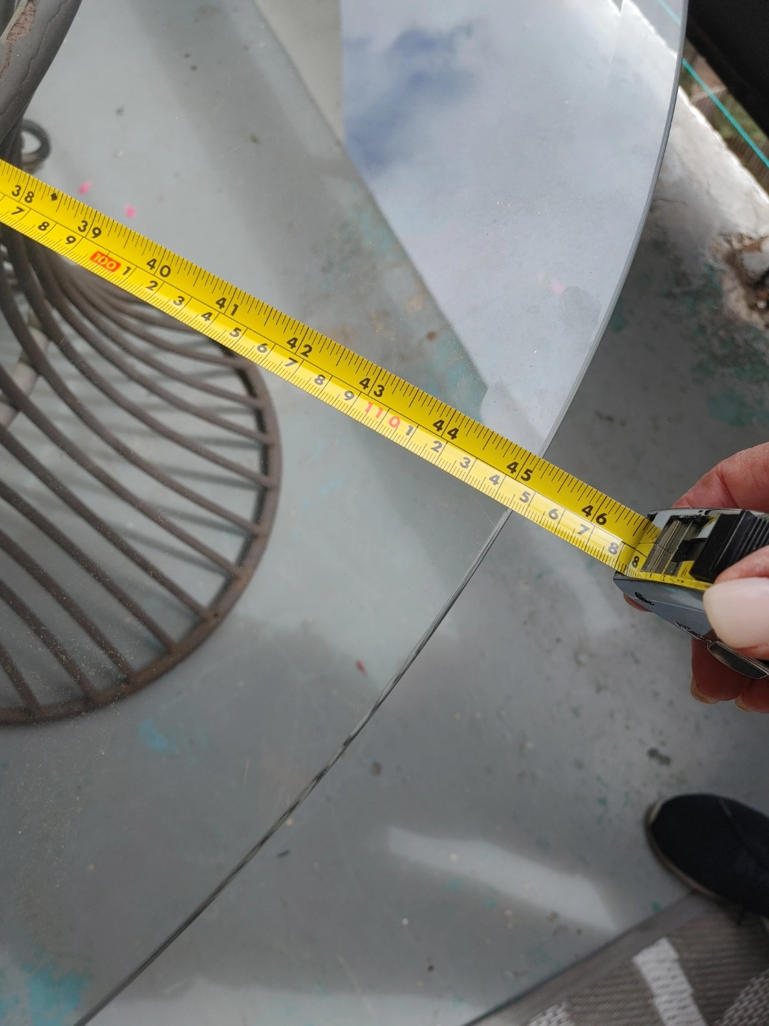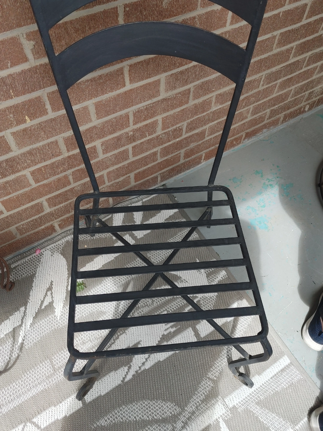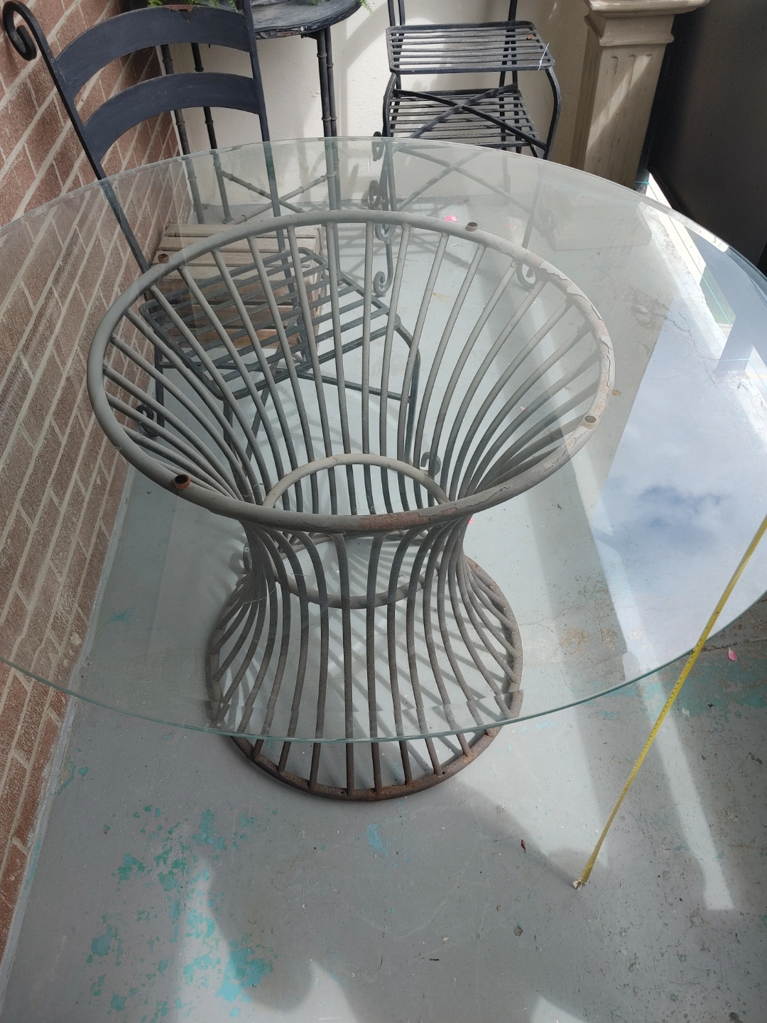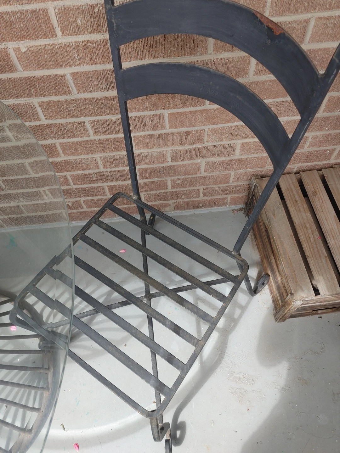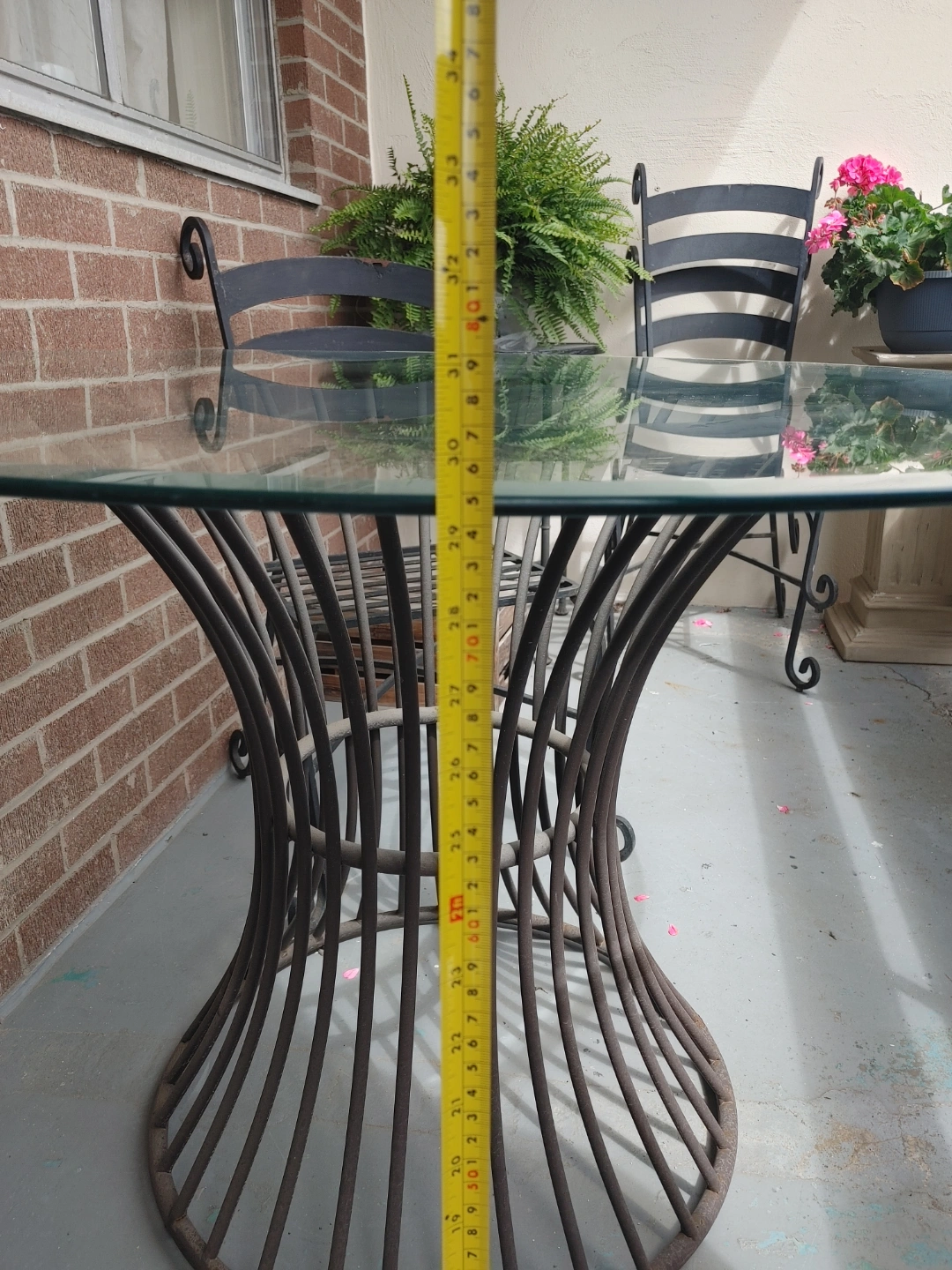 105Glass-top patio table with wrought iron base. four coordinating wrought iron chairs. Some rust and wear. Table diameter approximately 48 inches. Table height approximately 29 inches.
