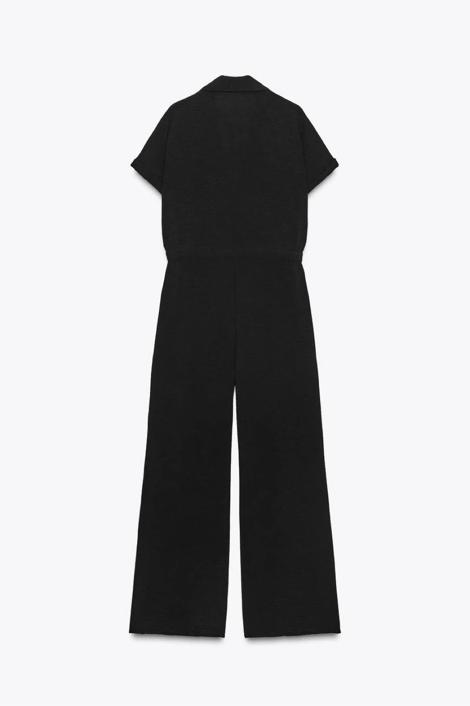 ZARA jumpsuit made from lightweight, flowing fabric. Features a lapel collar with a V-neckline, short sleeves with rolled hems, chest flap pockets, and metal button fastening. Adjustable drawstring waist for a comfortable and flattering fit.