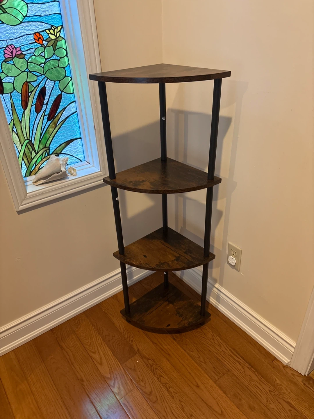 This corner shelf unit has three tiers with a rustic wood finish. The frame is black metal. It's great for displaying plants or books.