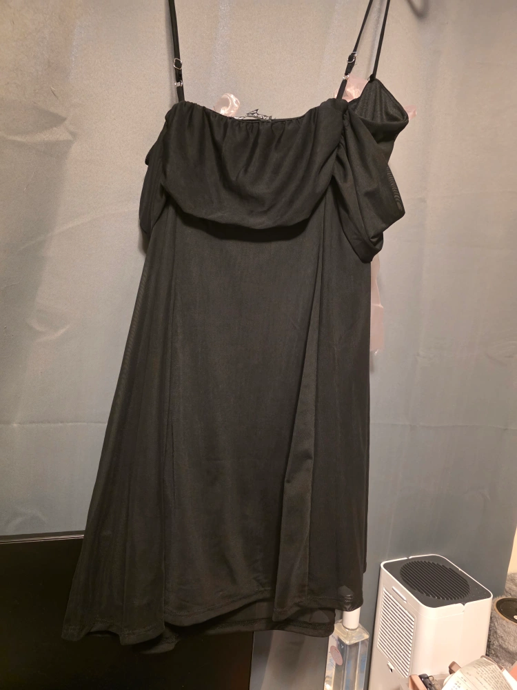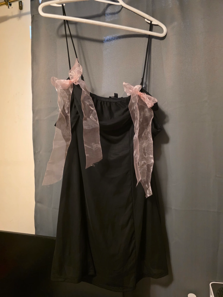 This is a cute black mini dress with pink bows in the front from Fashion Nova. It features adjustable straps and a flattering silhouette.