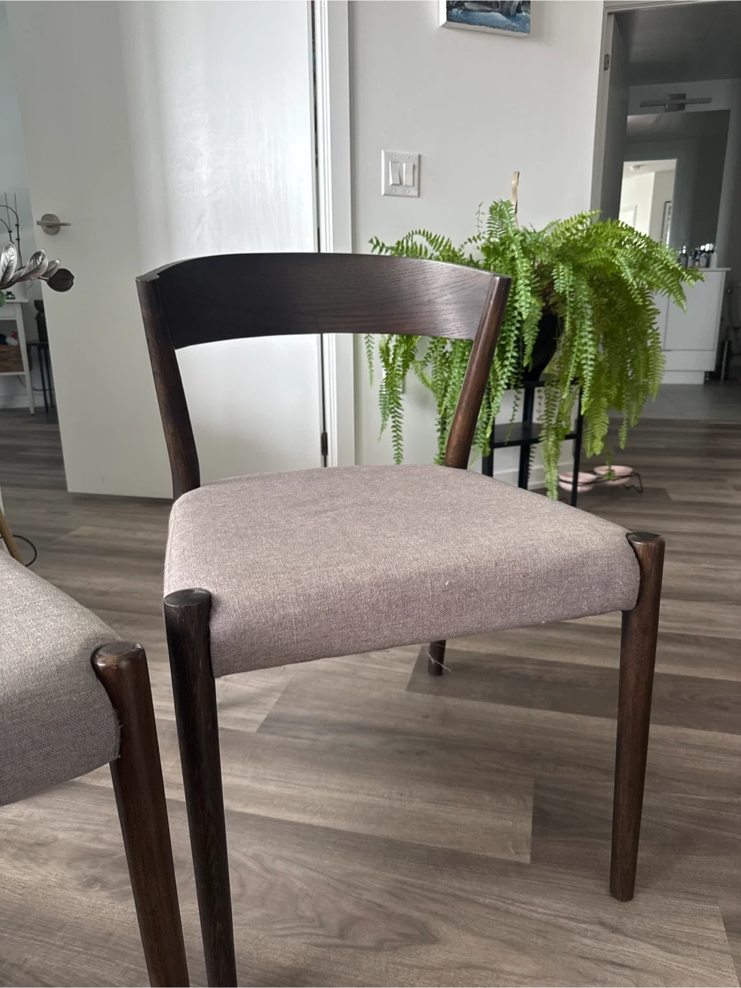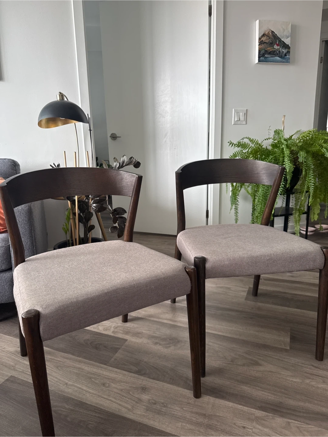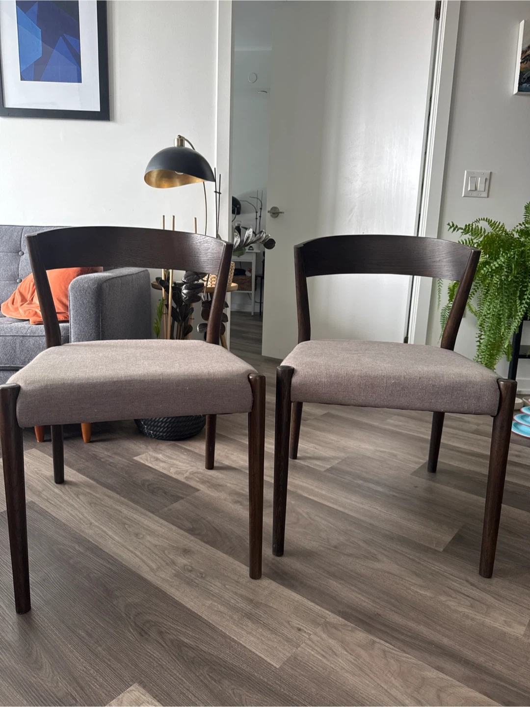 These dining chairs feature a dark wood frame with a comfortable upholstered seat in a light grey fabric. Their simple, clean lines offer a timeless mid-century modern aesthetic. They're perfect for a dining room or accent seating.