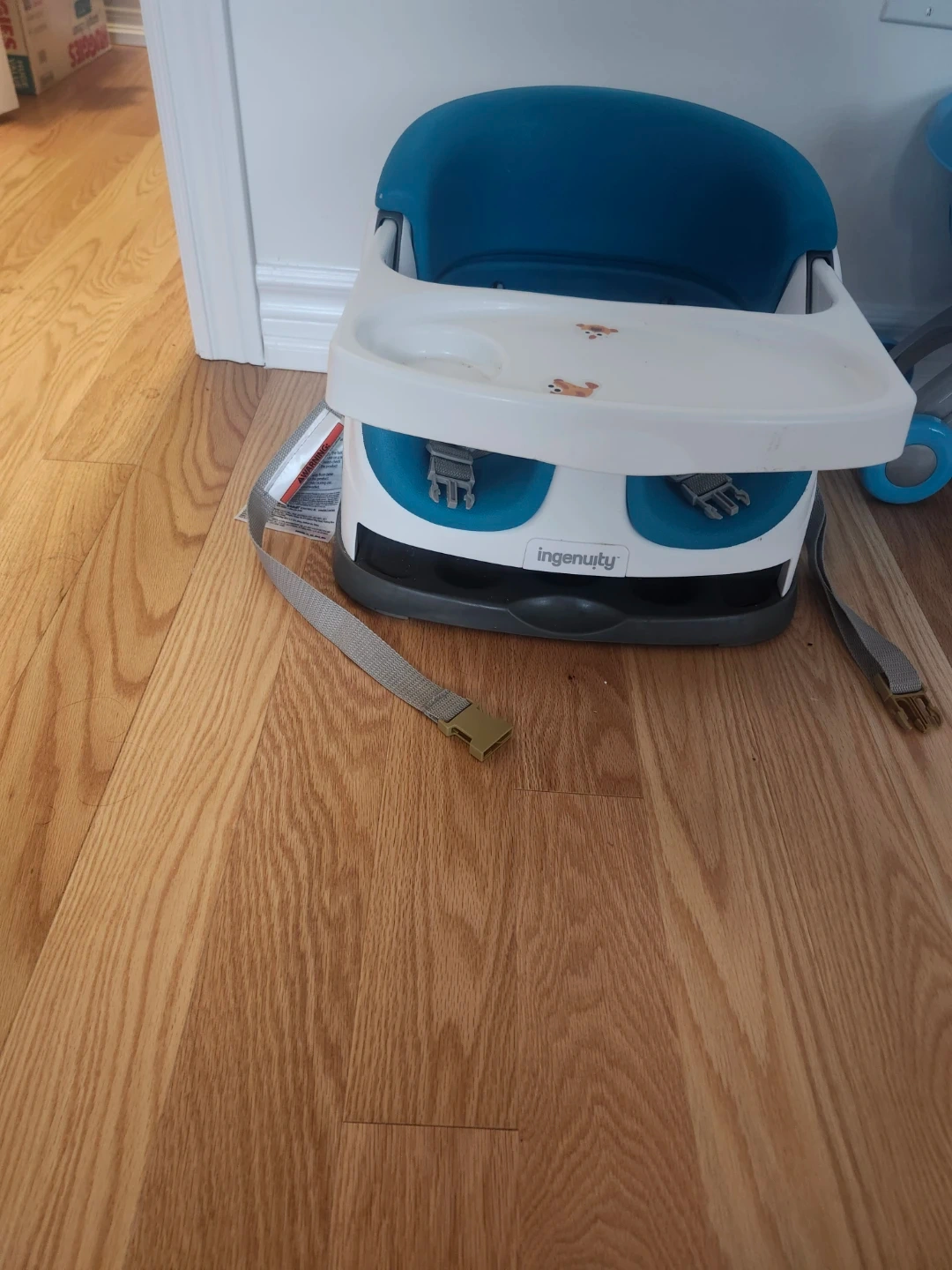Selling an Ingenuity Baby Base 2-in-1 seat in blue and white. It's in great condition and ready for your little one! This seat is perfect for helping your baby sit up and can be used on the floor or attached to a chair. It features a convenient tray and safety straps to keep your baby secure and comfortable