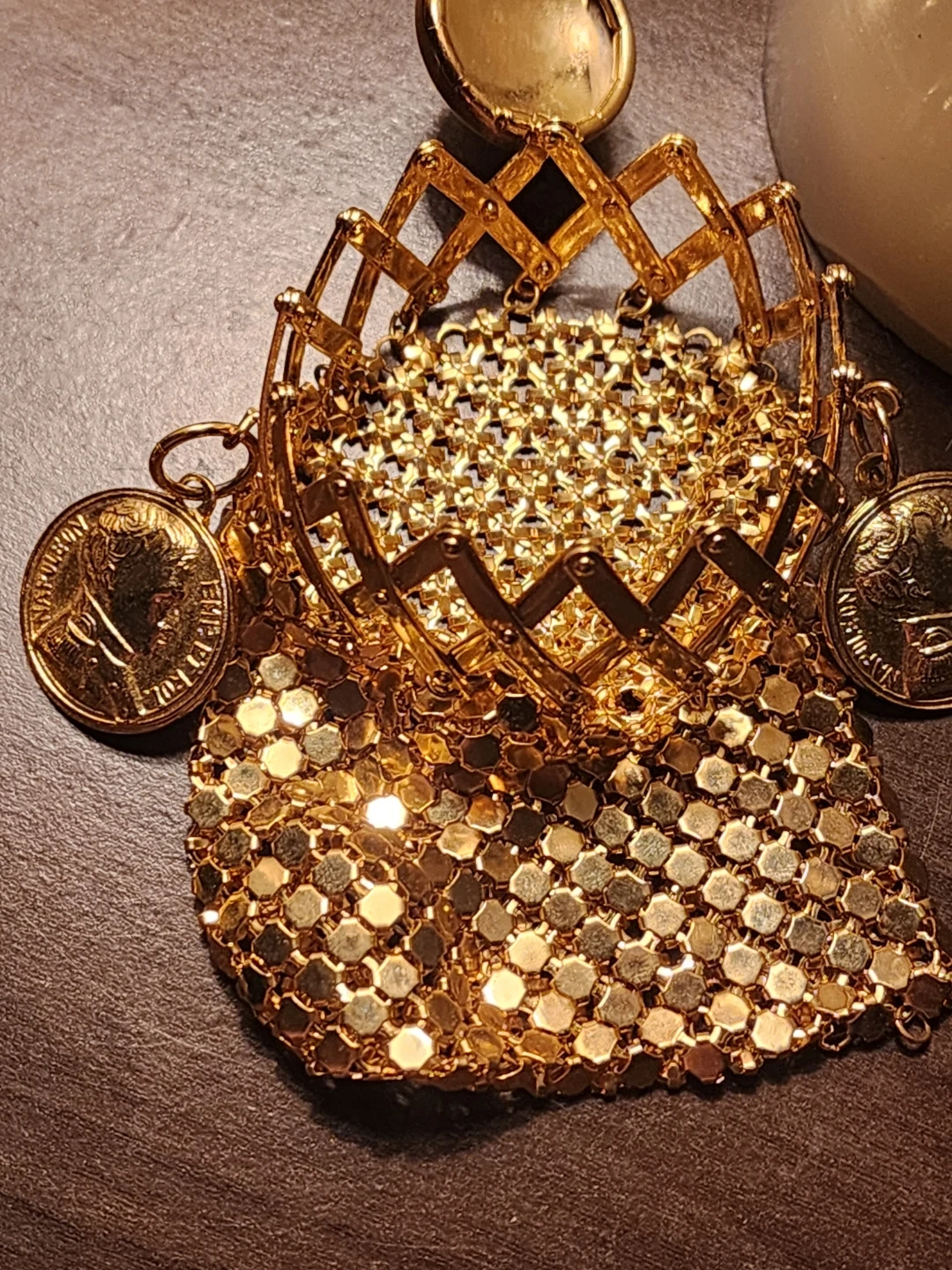 This is a vintage gold-tone mesh expandable coin purse, often referred to as a "beggar's bag" or "gate-top" purse, dating back to the Art Deco era, possibly the 1920s to 1950s. It features a distinctive metal mesh body and a functional gate-top mechanism that allows the opening to expand and contract like an accordion. This specific model includes two decorative coins attached to the frame: one featuring a portrait of Napoleon and the other depicting the Rhode Island ship.