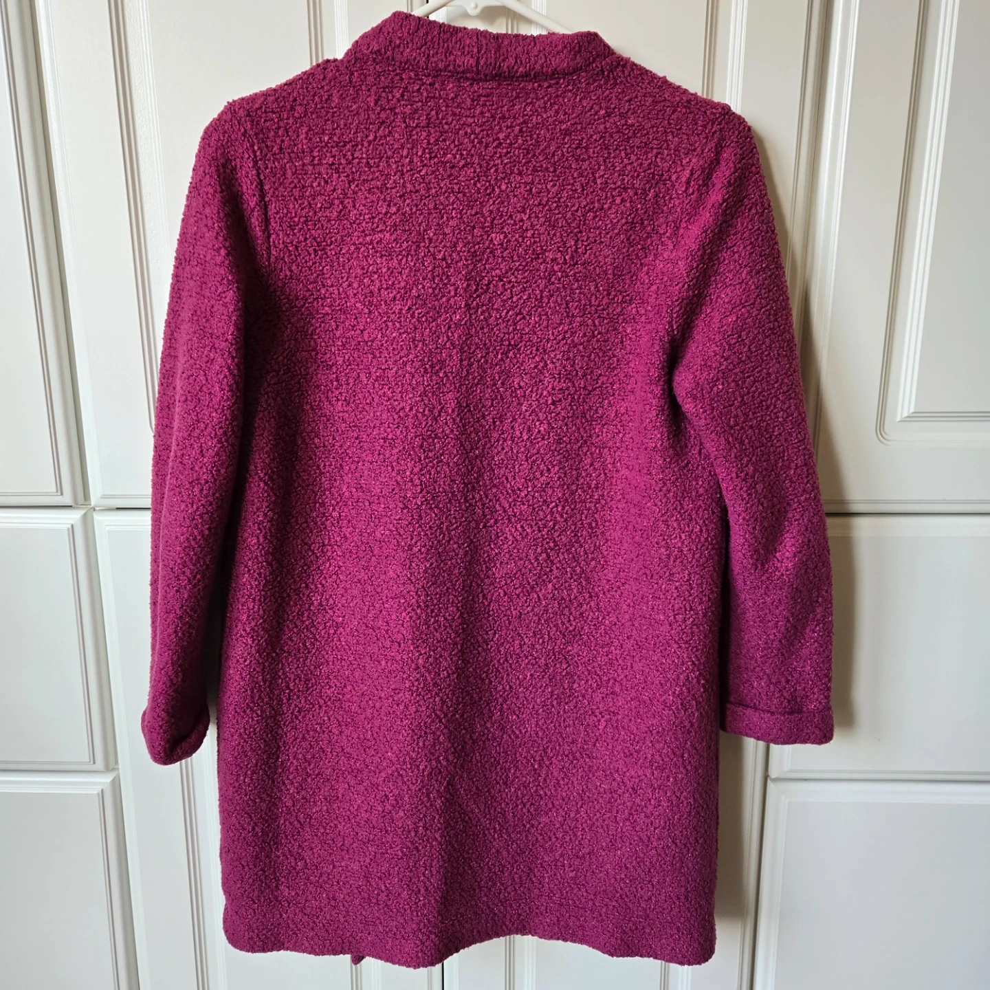 This Reitmans cardigan is a vibrant magenta colour and features pockets. Made from 95% viscose and 5% elastane for the body, with 100% polyester sleeves and yoke. Perfect for layering during cooler weather!