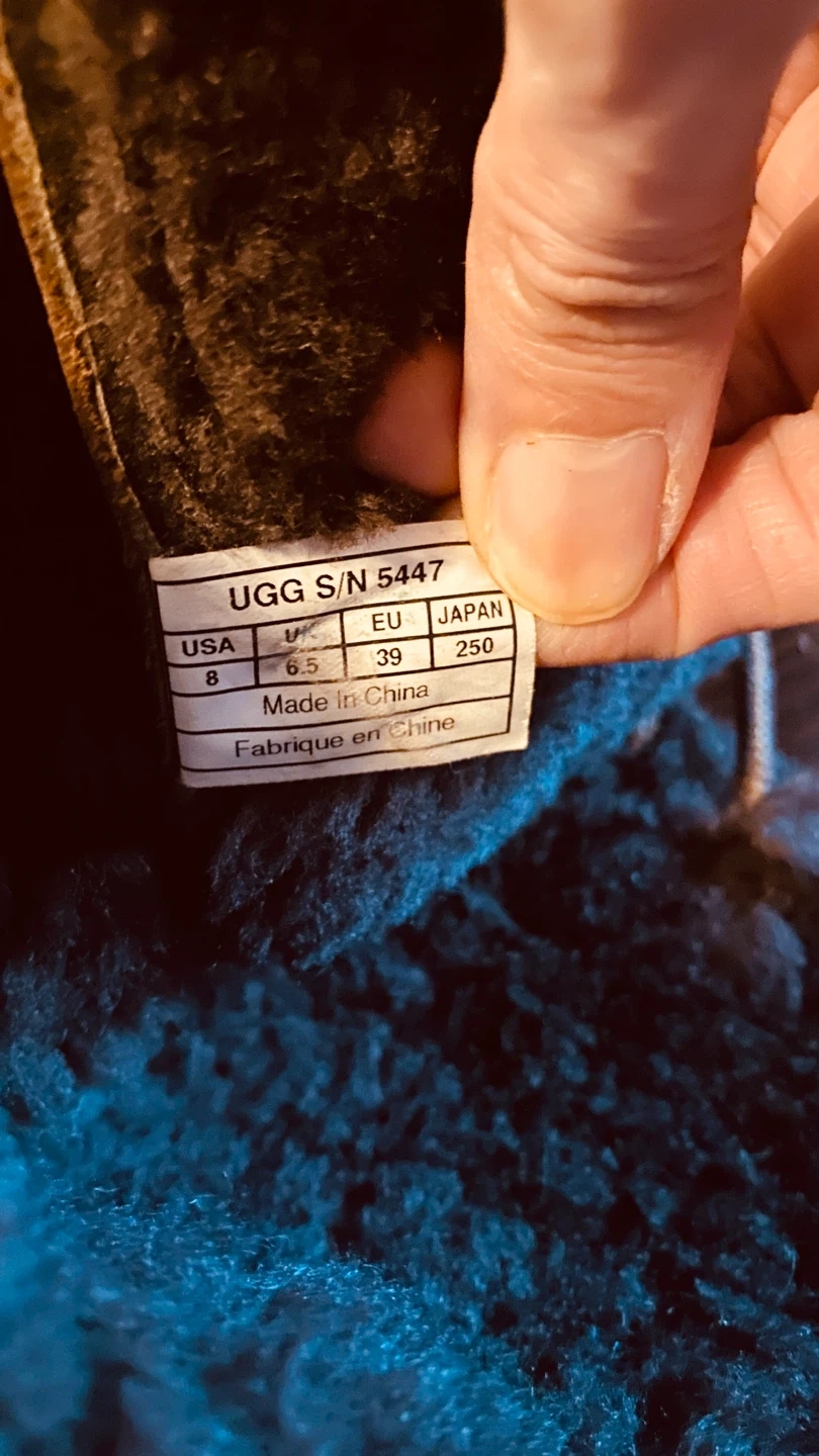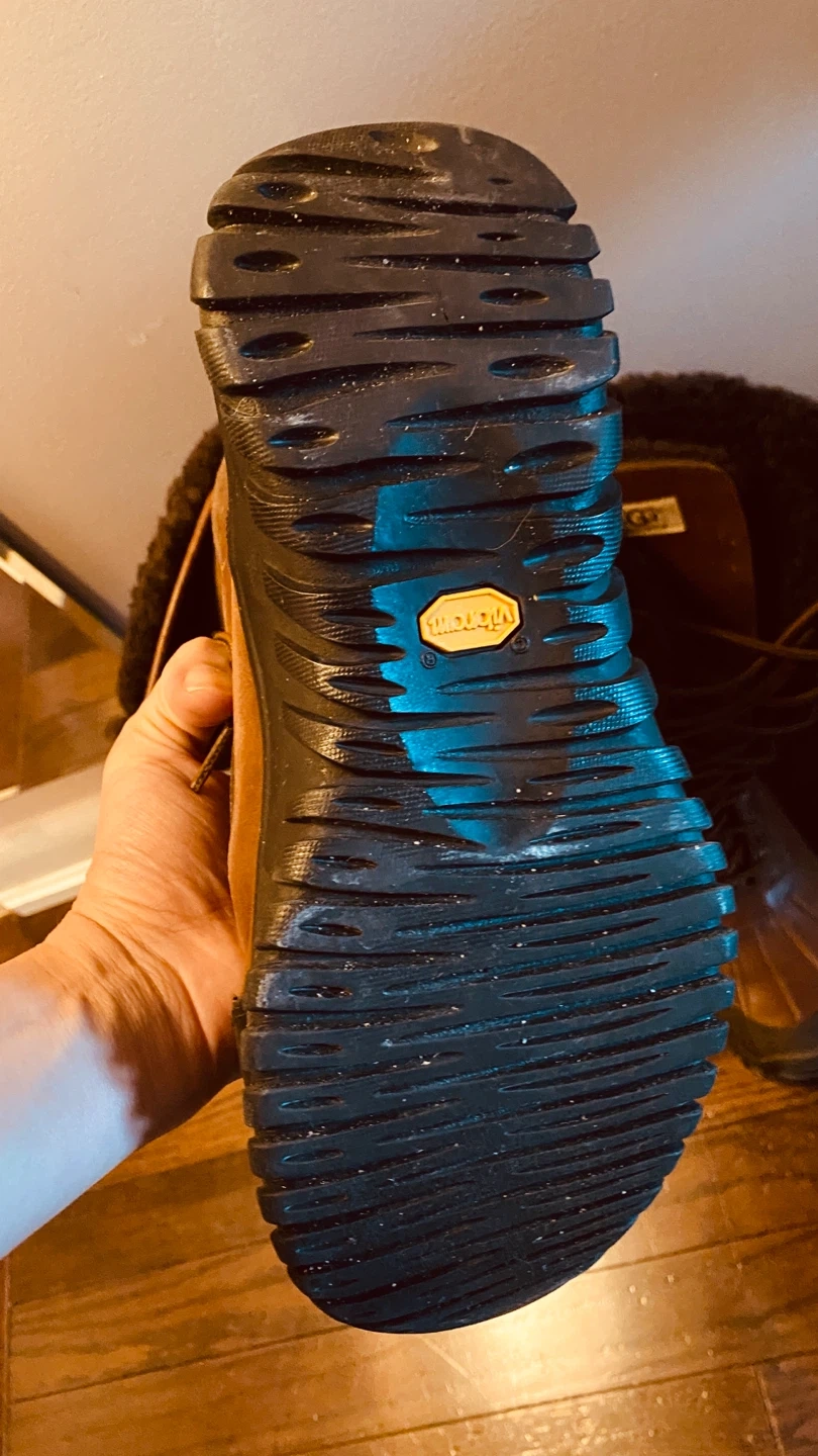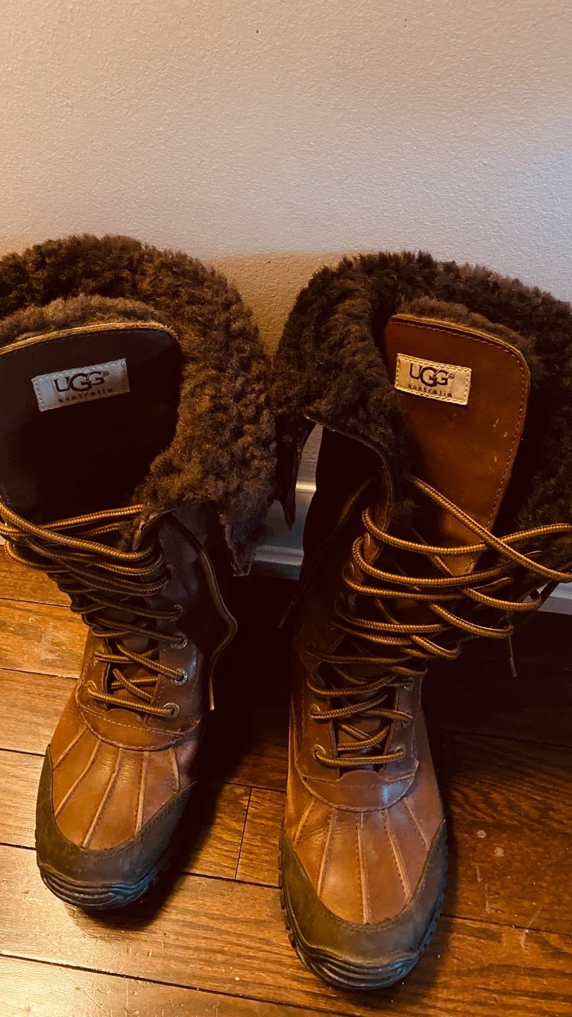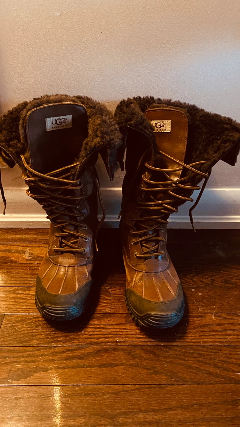 These UGG Australia winter boots are a size 8 US. They're made with a leather and synthetic upper and feature a warm shearling lining. The Vibram sole provides excellent traction for snowy conditions!