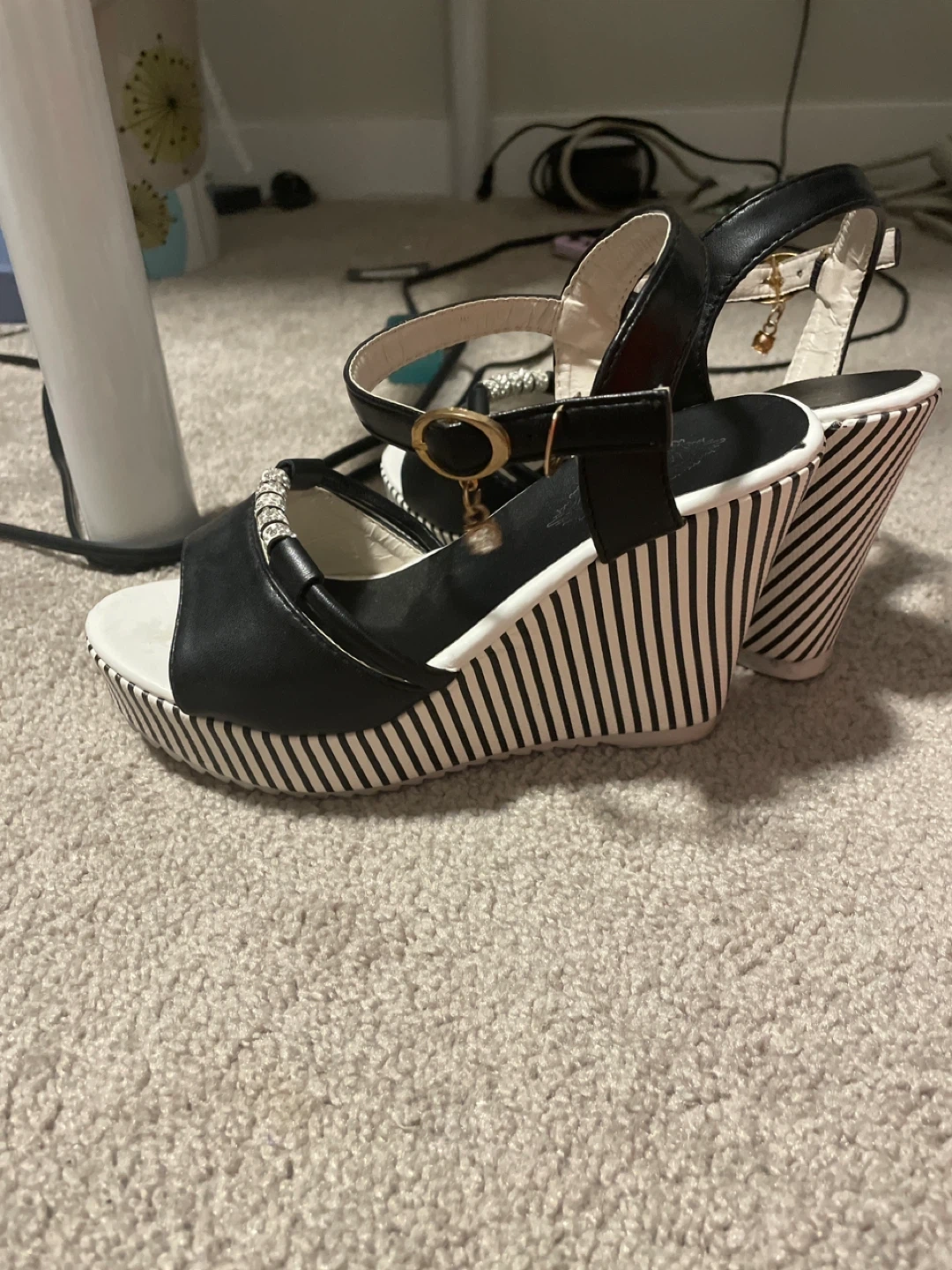 Stylish black and white wedge sandals with rhinestone embellishments. These feature an ankle strap with buckle closure. The wedge heel has a bold stripe pattern.