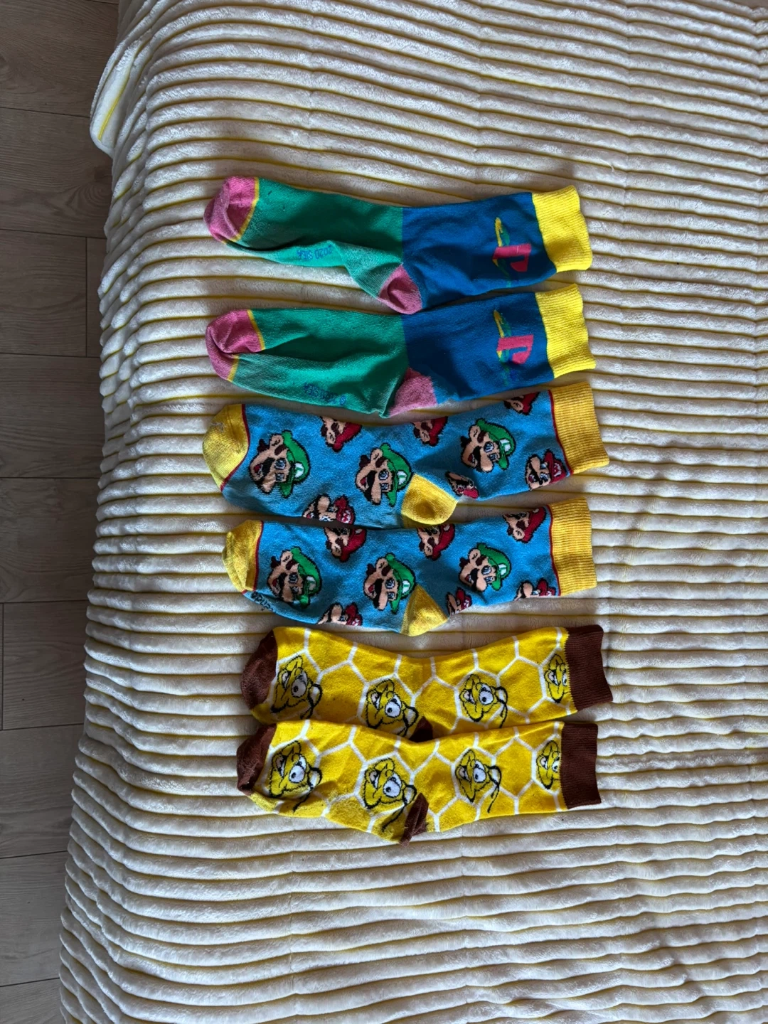Three pairs of fun character socks! Features Mario and Luigi, PlayStation, plus one pair with a Honey Nut Cheerios honeycomb design. Made from a soft, stretchy material. Perfect for any Nintendo fan!