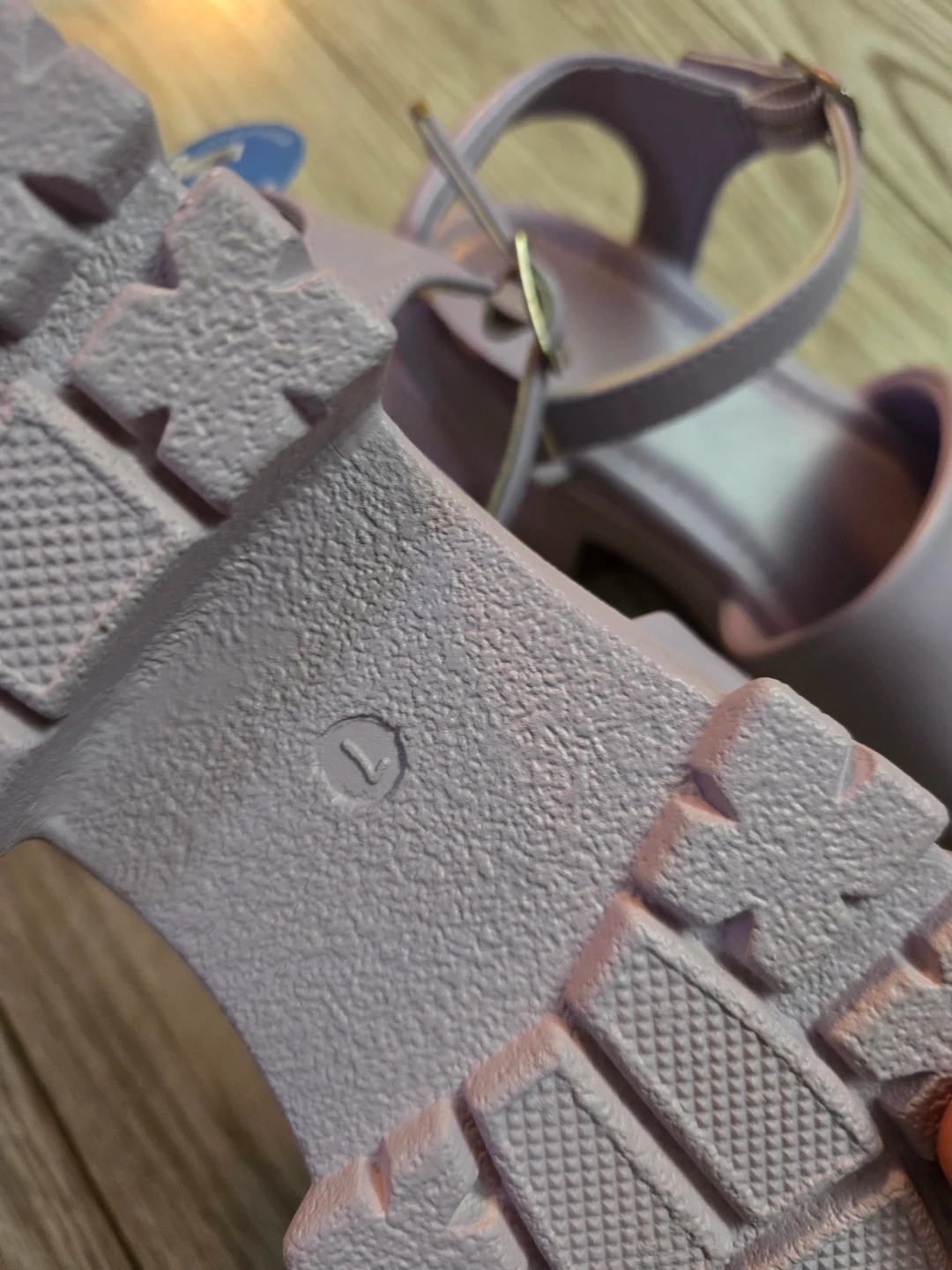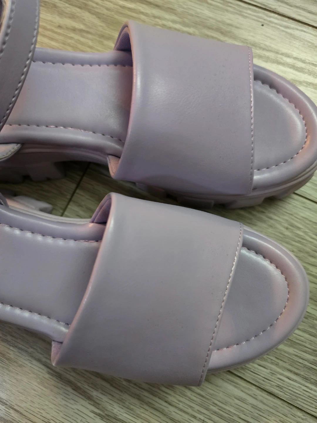 These cute lilac platform sandals have a buckle closure and a sturdy lug sole. They're made with a synthetic material and feature a comfortable strap design. Soft padded comfortable to wear.