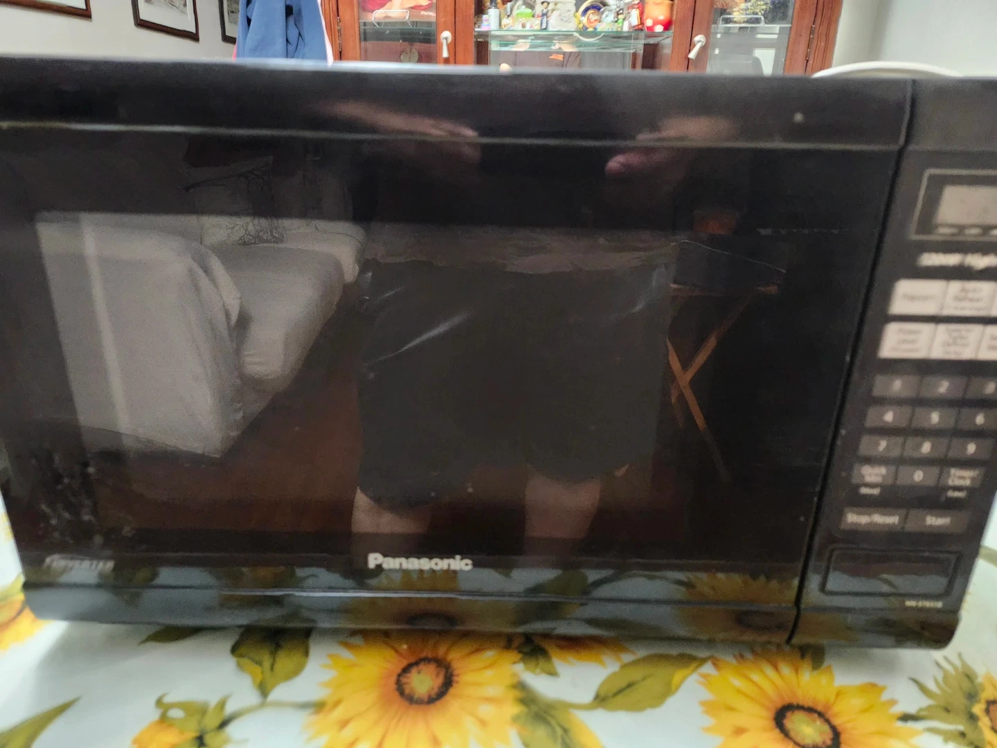 This is a black Panasonic microwave with a glass turntable inside. It has a digital display and a numeric keypad for settings. Perfect for reheating leftovers or quick meal prep!