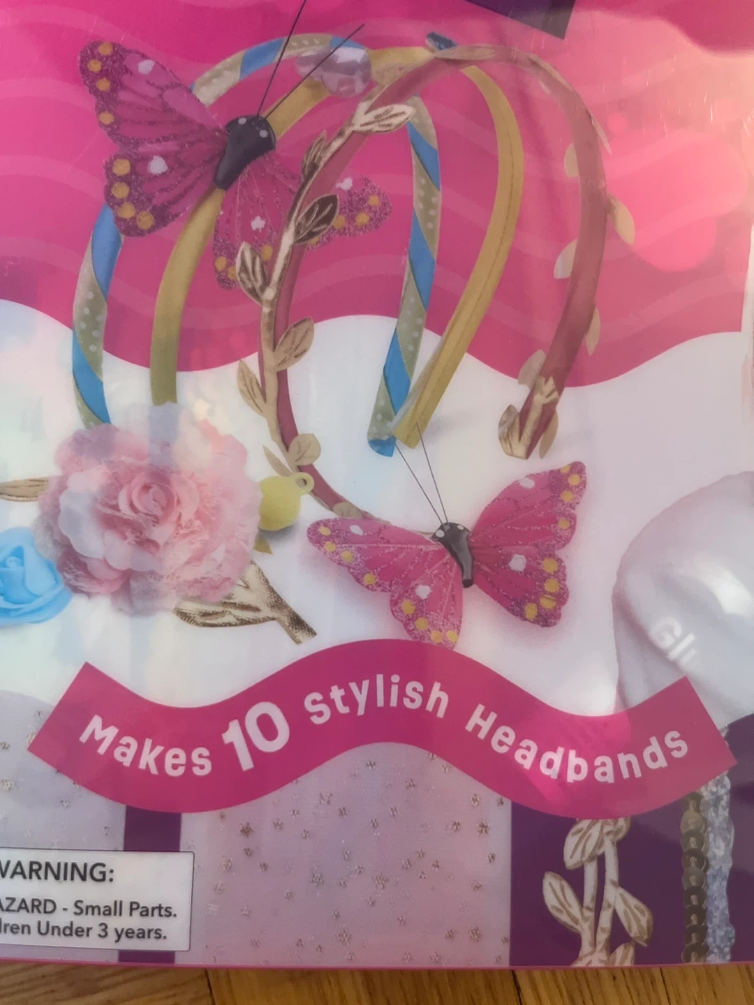 This kit lets you make 10 stylish headbands. It includes satin headbands, wide ribbons, thin ribbons, ribbon trims, faux fur pom poms, assorted rhinestones, flowers, felt loop fasteners, butterfly string, and glue. Ages 5+ and over 50 pieces!