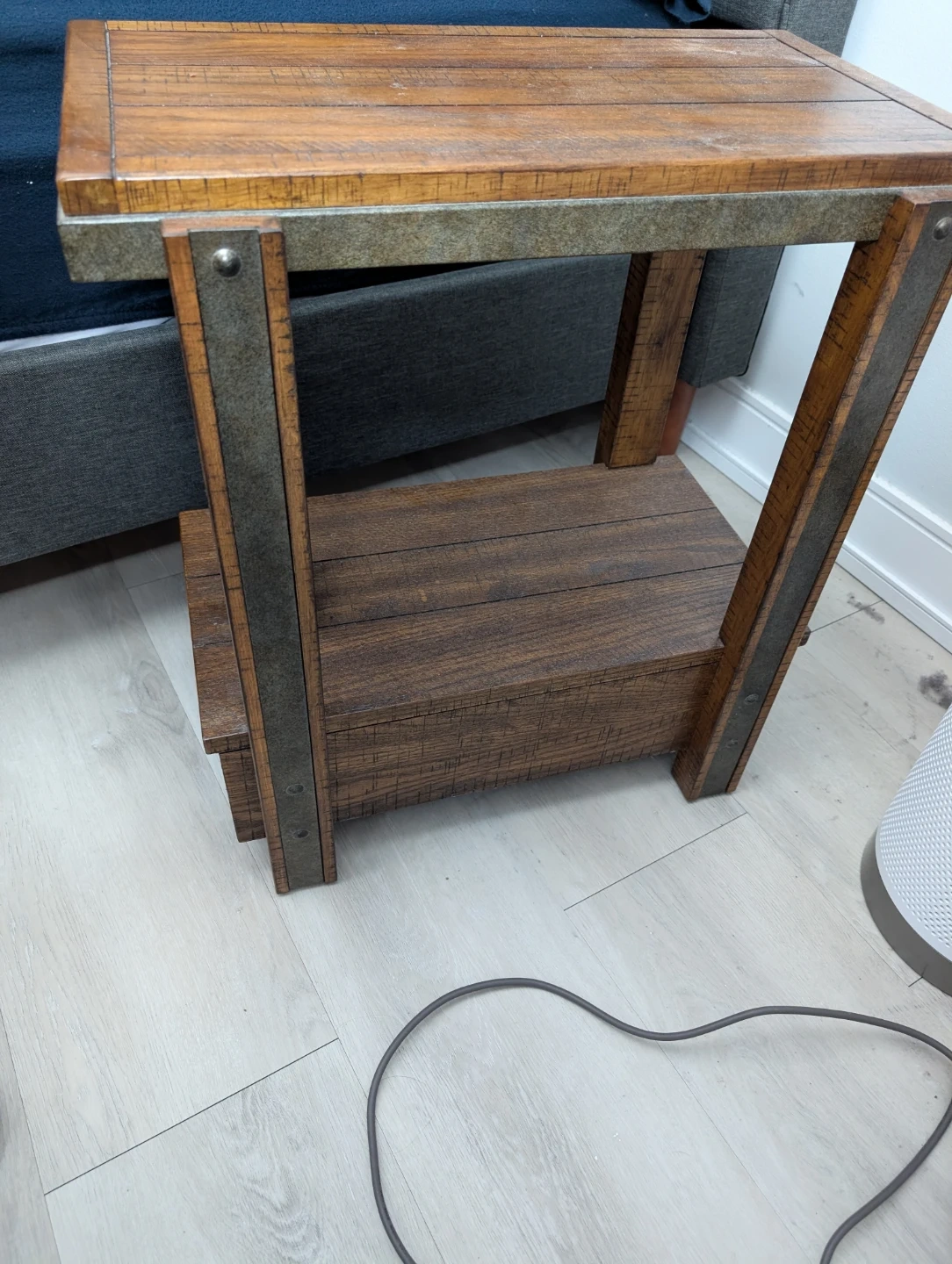 This rustic-style side table is made of wood with metal accents. It features a spacious top surface, a middle shelf, and a convenient drawer for storage. It's perfect for beside your bed or sofa. The table has a solid wood construction. Made with wood not vinal or cheap chip board