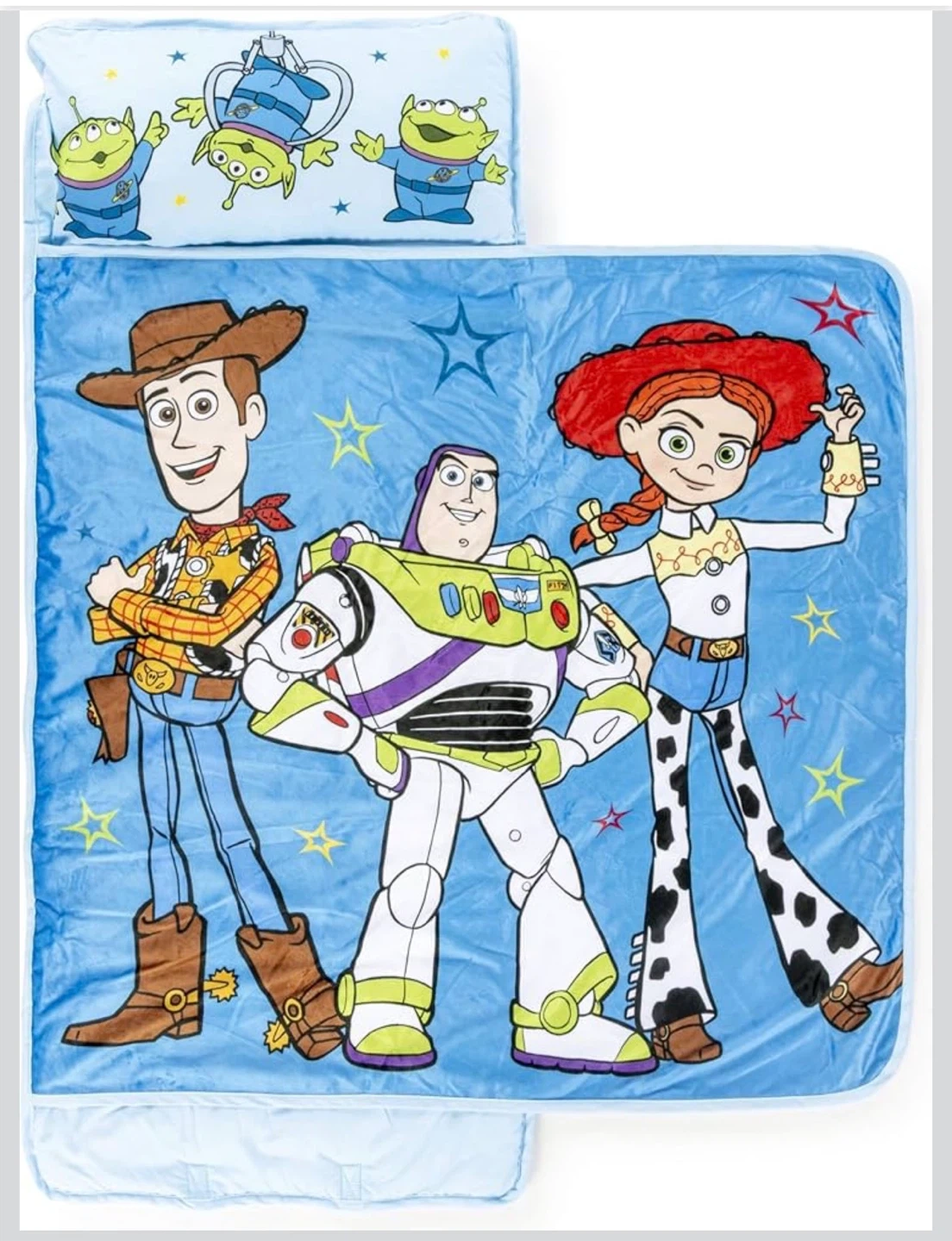This nap mat features Woody, Buzz Lightyear, and Jessie from Toy Story. It includes a pillow and rolls up for easy storage with a handle. It's perfect for daycare or travel!