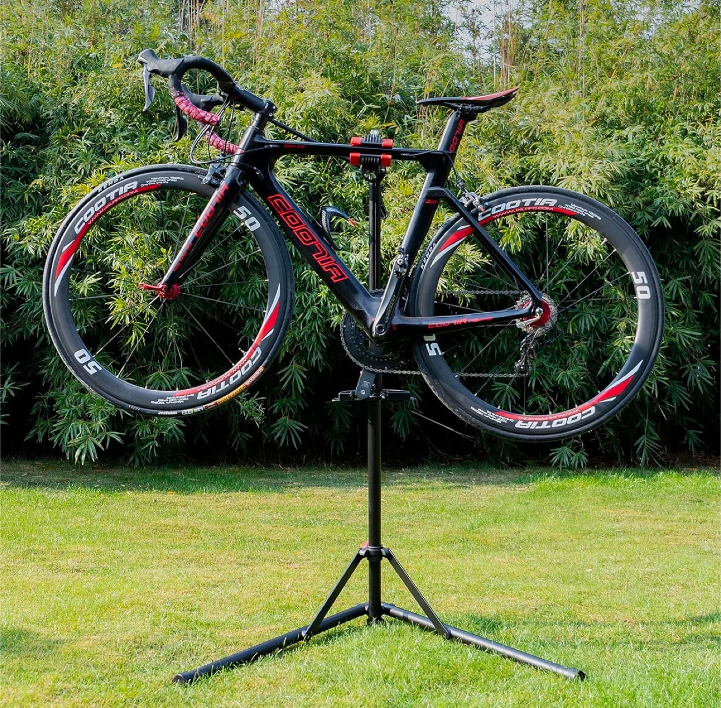This sturdy bike repair stand features a 360-degree rotating clamp with rubber pads to avoid scratches. It's height adjustable from 90.5 to 146.5 cm and includes a magnetic, rotatable tray for tools and screws. A great stand for bike maintenance!