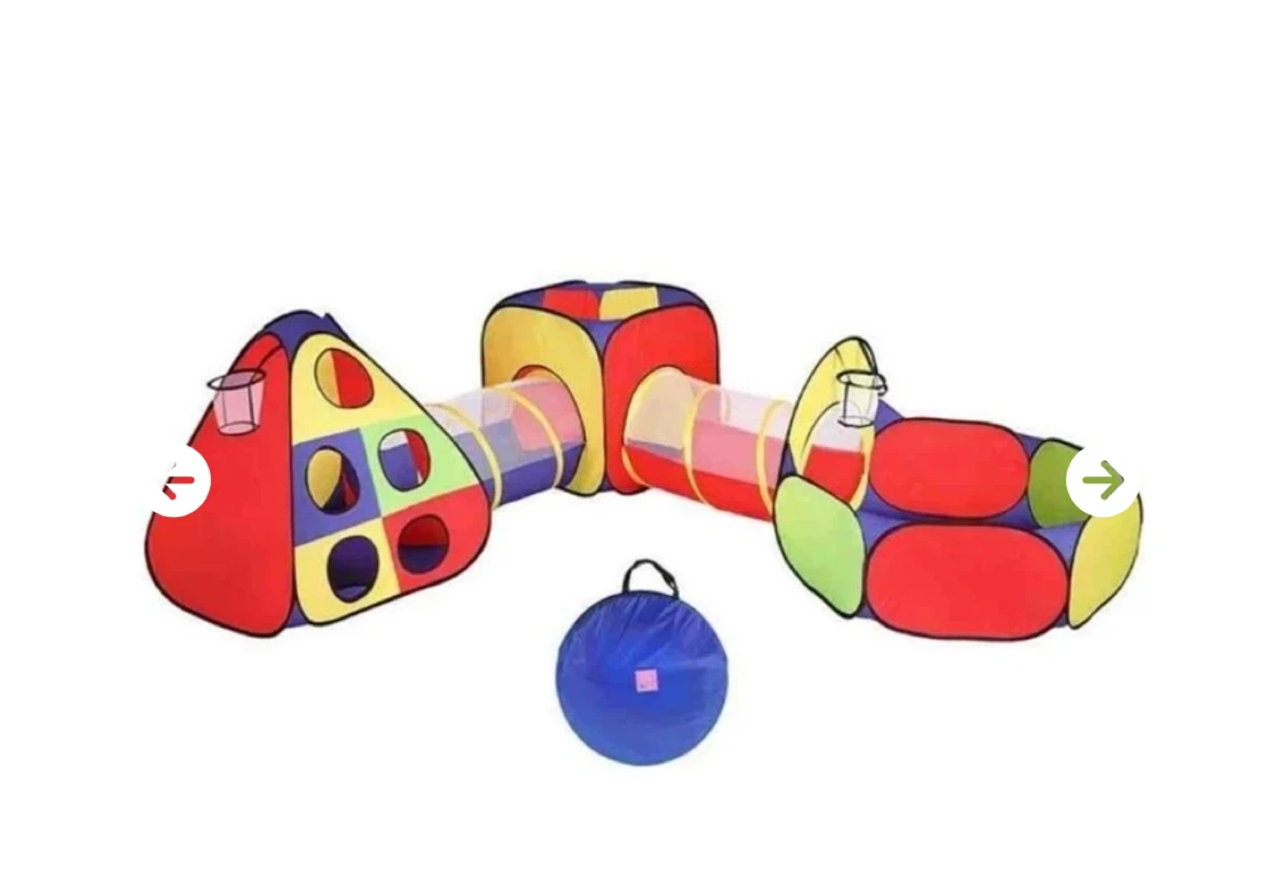 A colourful play tent with a cube and two tunnels. It includes two basketball hoops for added fun! It's made of fabric and comes with a blue carrying bag for storage.