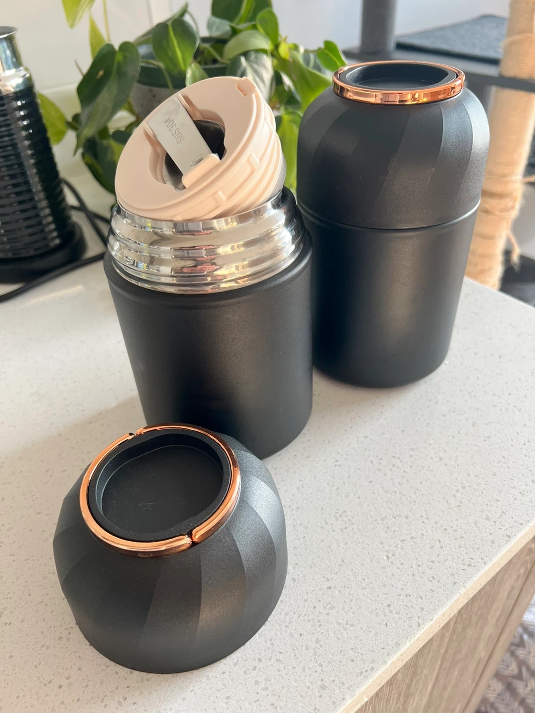 • Design: Sleek black finish with copper/rose gold details.