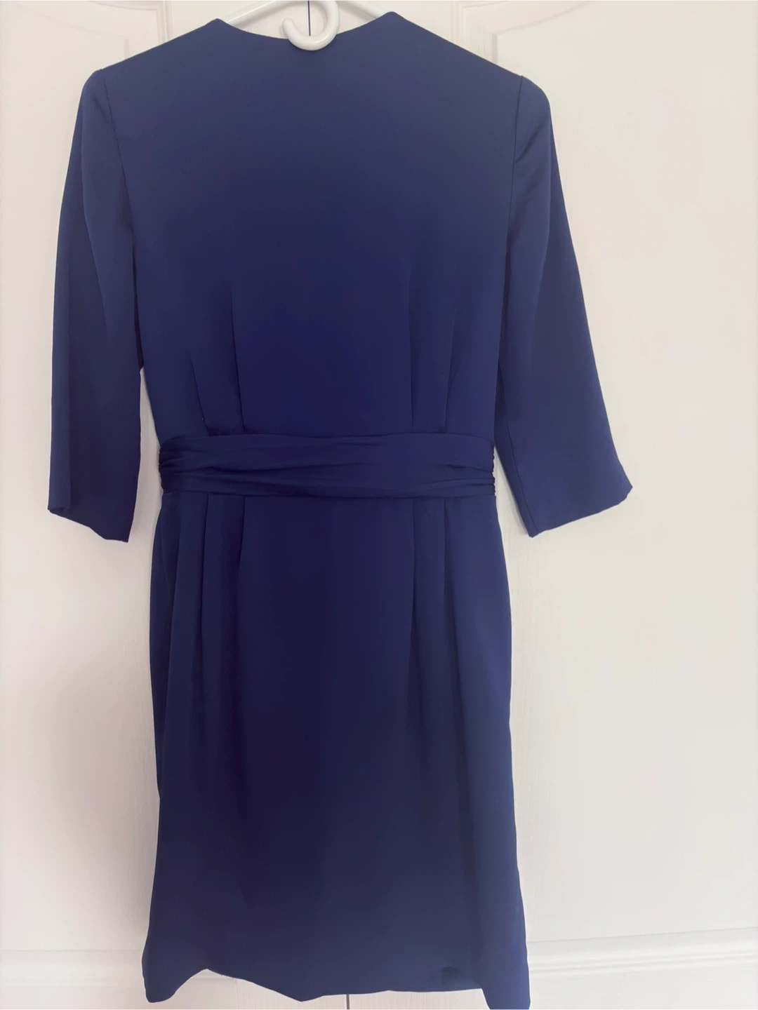 Banana Republic navy blue wrap dress with a tie waist. It has a V-neck and three-quarter sleeves. This dress is suitable for professional or evening wear.