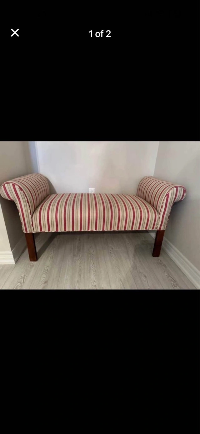 51" long x 23" deep x 17" high. Foam is in great shape. Use for display or sitting. Wood frame with thick solid coils underneath. Colour is a fuchsia / green / cream stripe. Smoke-free, pet-free home. Steam cleaned. Cashless payment accepted. Cash accepted. Curbside pick up only.