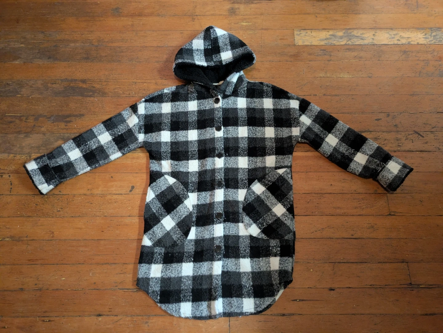 Cozy plaid flannel shacket with a hood. Features a button-up front and two large front pockets. This piece is perfect for layering during cooler weather.