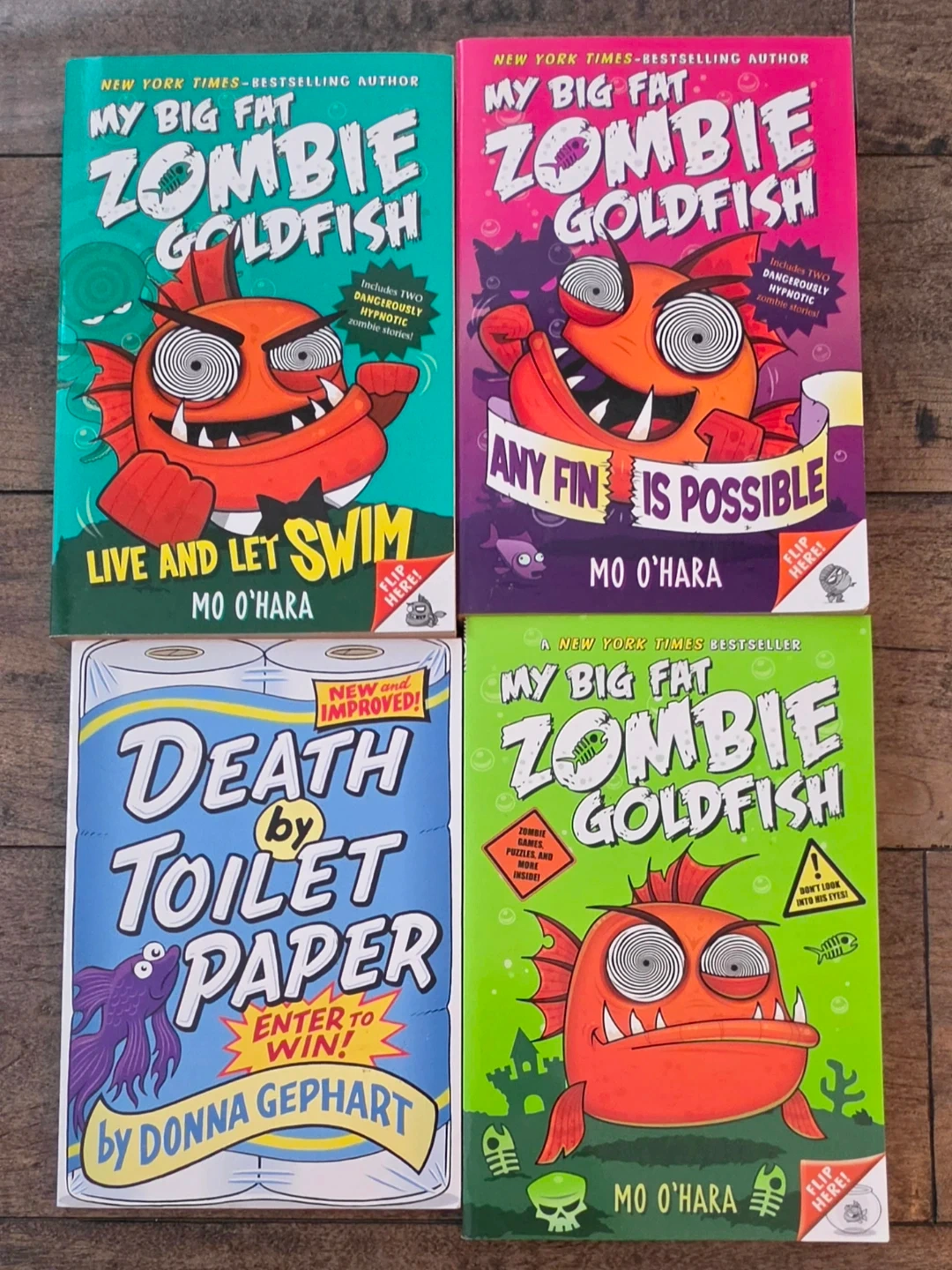 This lot includes three books from the My Big Fat Zombie Goldfish series and one book titled Death by Toilet Paper. The Zombie Goldfish books are by Mo O'Hara and include "Live and Let Swim" and "Any Fin Is Possible". The "Death by Toilet Paper" book is by Donna Gephart. These are great books for young readers who enjoy humour and silly stories!