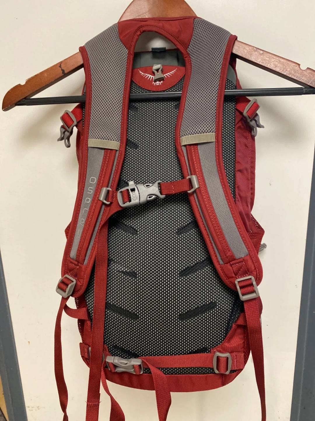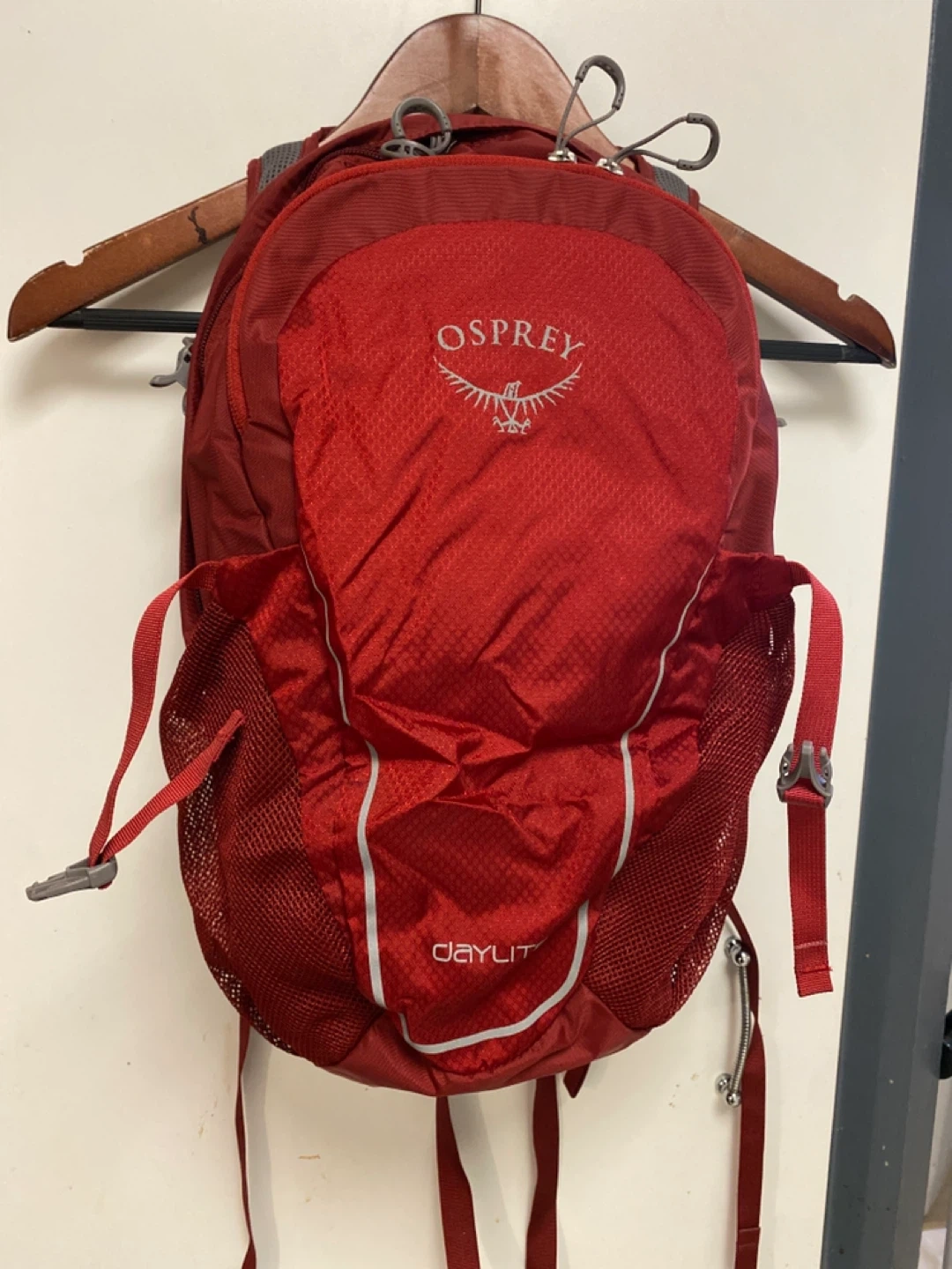 This is an Osprey Daylite backpack. It's a compact and lightweight pack, perfect for day trips. Features mesh side pockets for water bottles and adjustable straps.