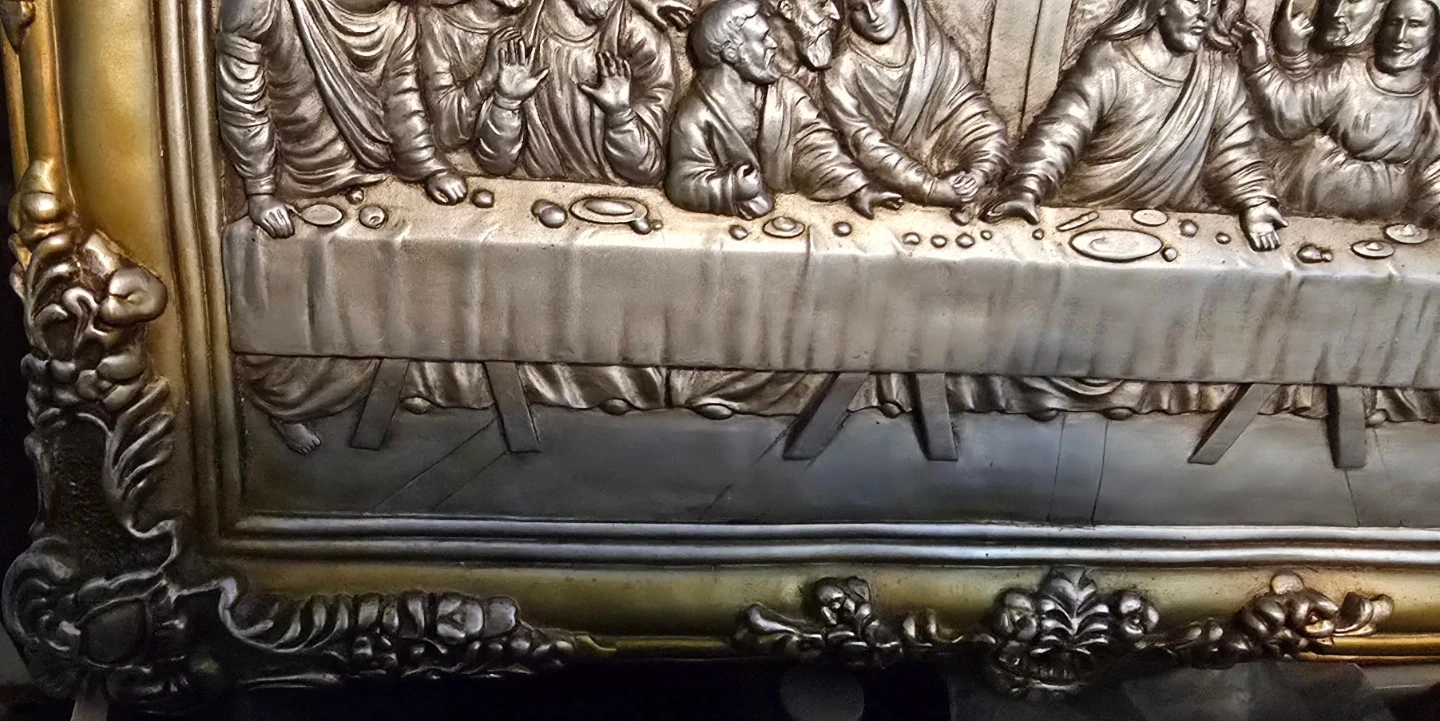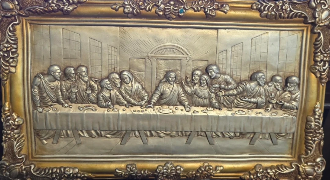 š„This is an antique vintage art piece depicting The Last Supper. Very detailed hand sculptured piece, made many decades ago, The artwork is very solid heavy piece gold with a silver finish.