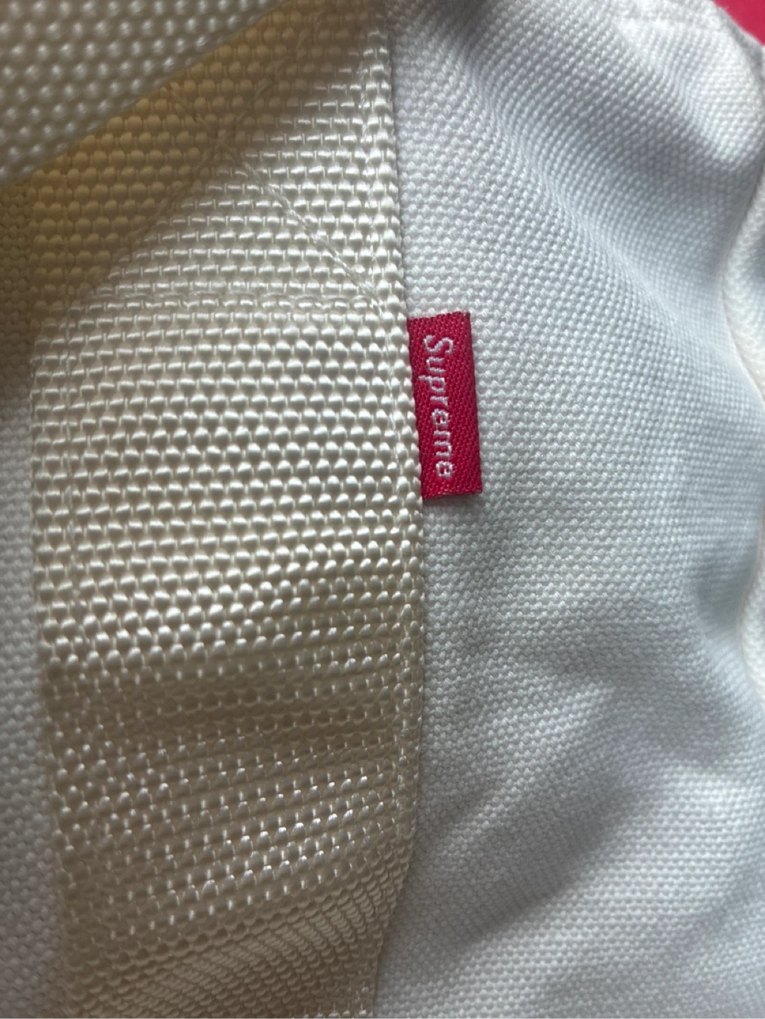 Selling a Supreme canvas tote bag. It's a great everyday bag. There is normal wear and stains but overall looks great. Still in very decent condition zippers everything works . Needs TLC but certainly a very sturdy and durable tote made by Supreme.