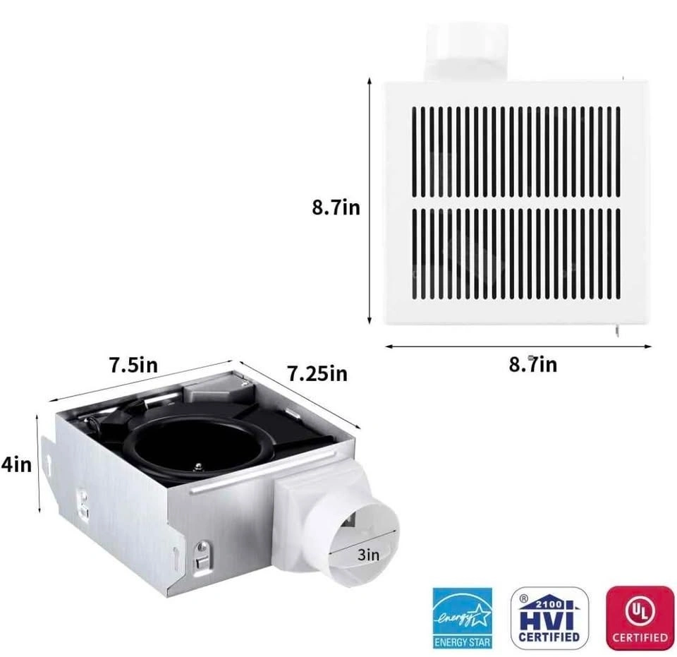 Super quiet bathroom fan (1.0 sones) and strong air movement (50CFM) for bathrooms up to 50 Sq. Ft. Recommended for use in small rooms. Note: Use 3 inch ducting.