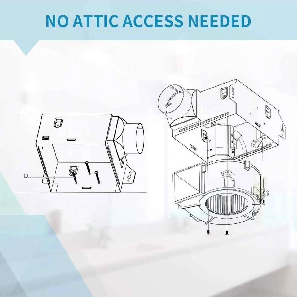 Easy-to-install: No cut housing with no attic access installation and replaces most small bathroom standard fans using existing opening. It can be done entirely from the room-ceiling side – no attic access needed installation.