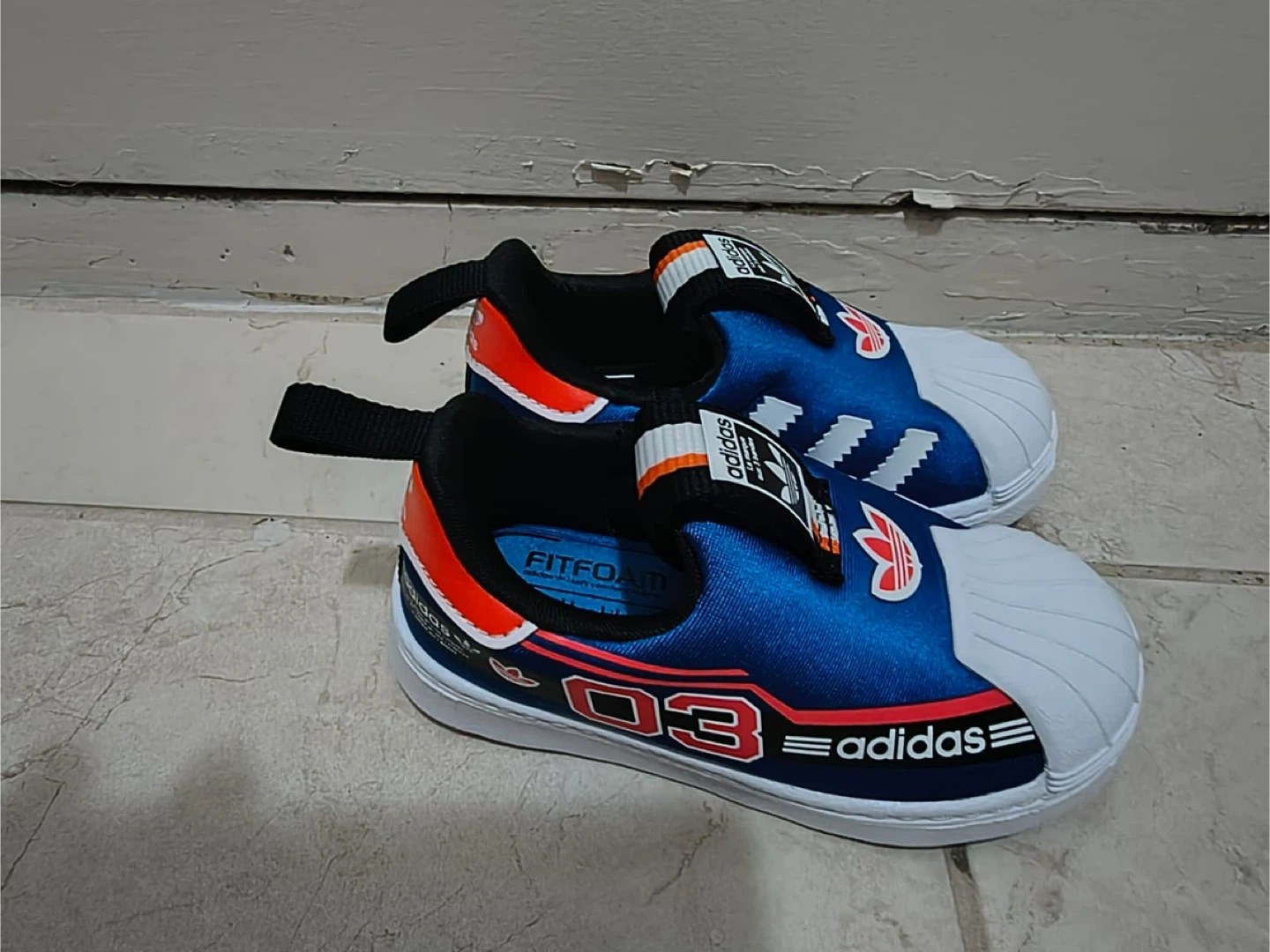 These Adidas Superstar 360 slip-on shoes are perfect for your little one! They feature a comfortable FITFOAM footbed and a stylish design with the iconic Adidas stripes and logo. The shoes are blue, white, and red, making them a fun and versatile addition to any outfit